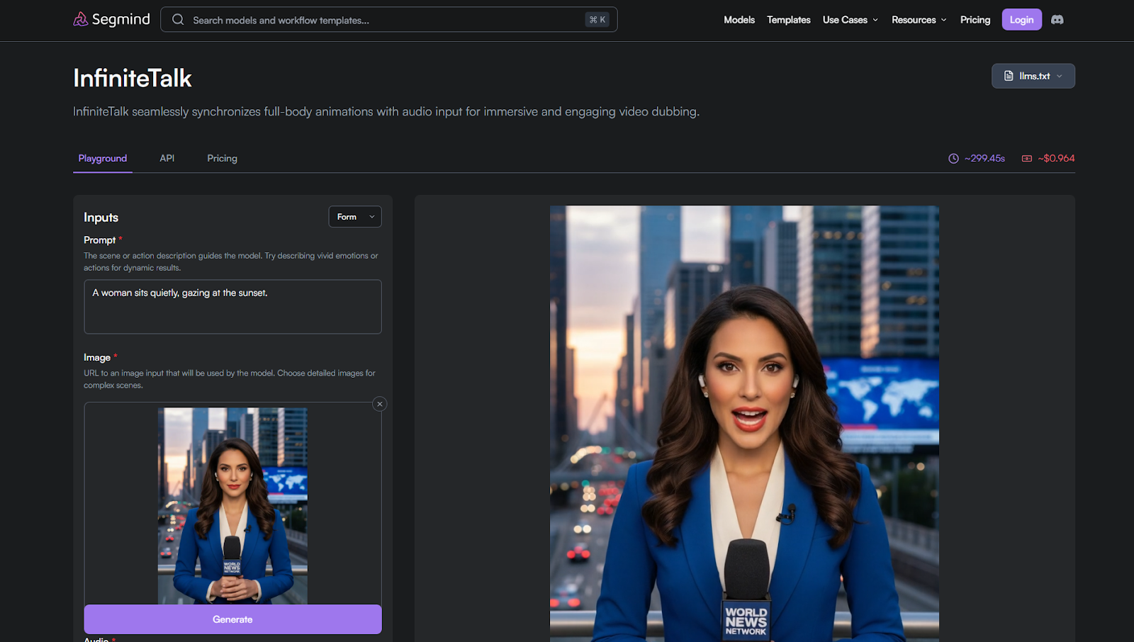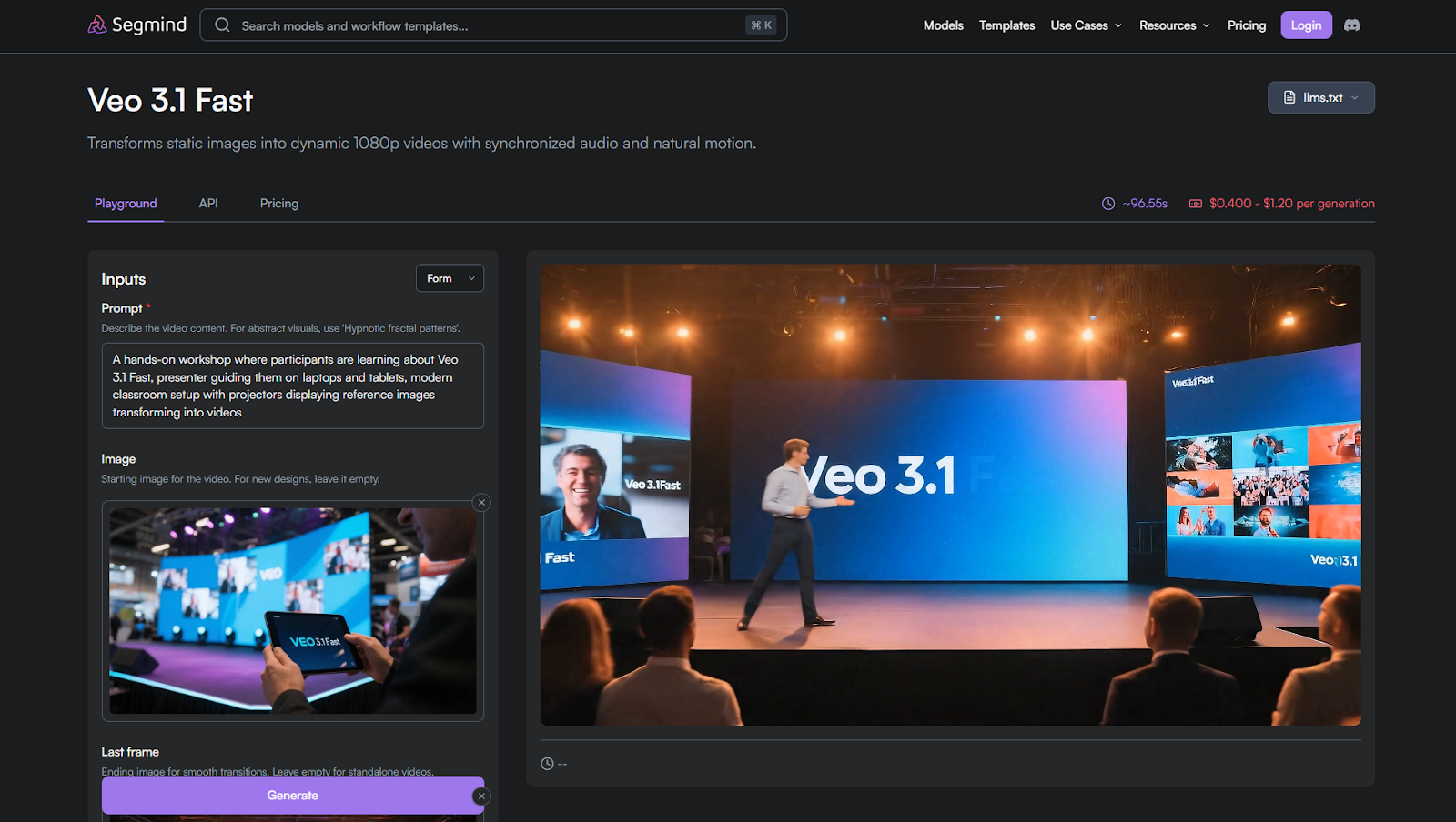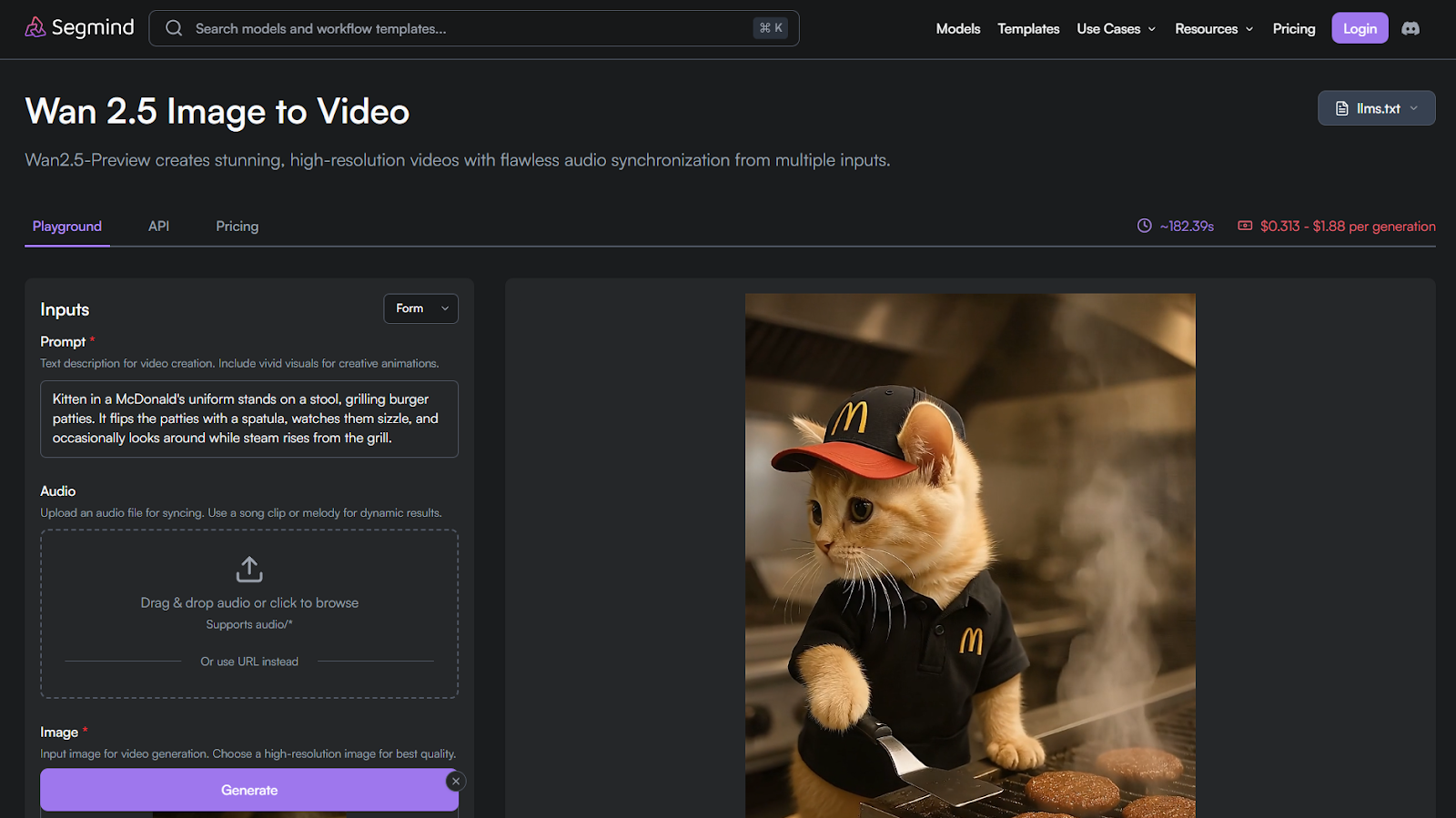 Average Time/Generation on Segmind: ~185.74s | Pricing/Generation on Segmind: $0.313–$1.88 per generation
