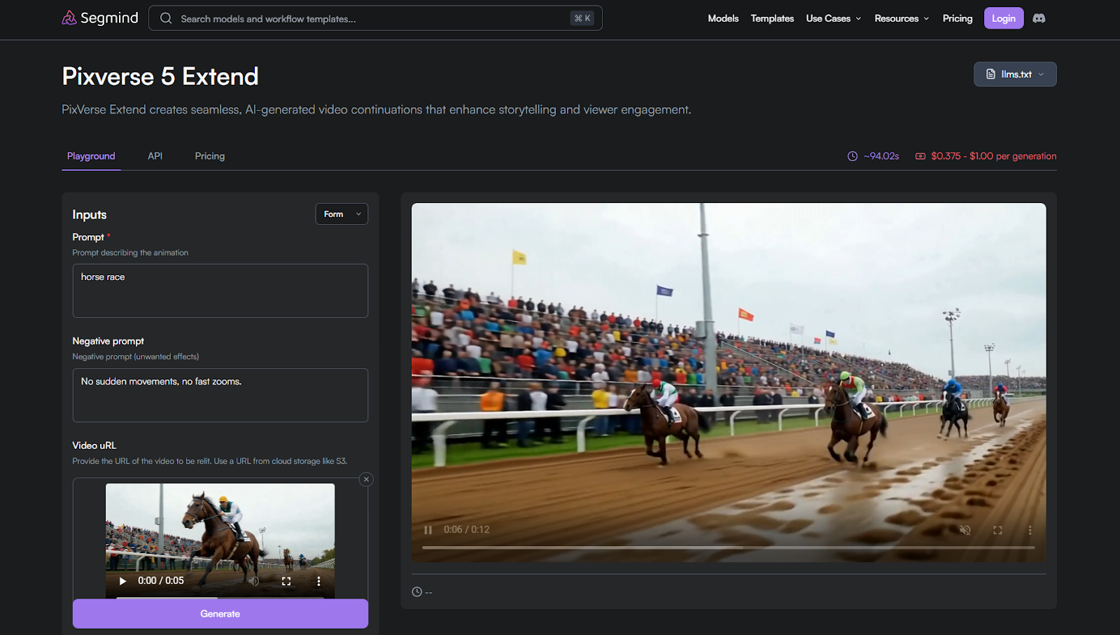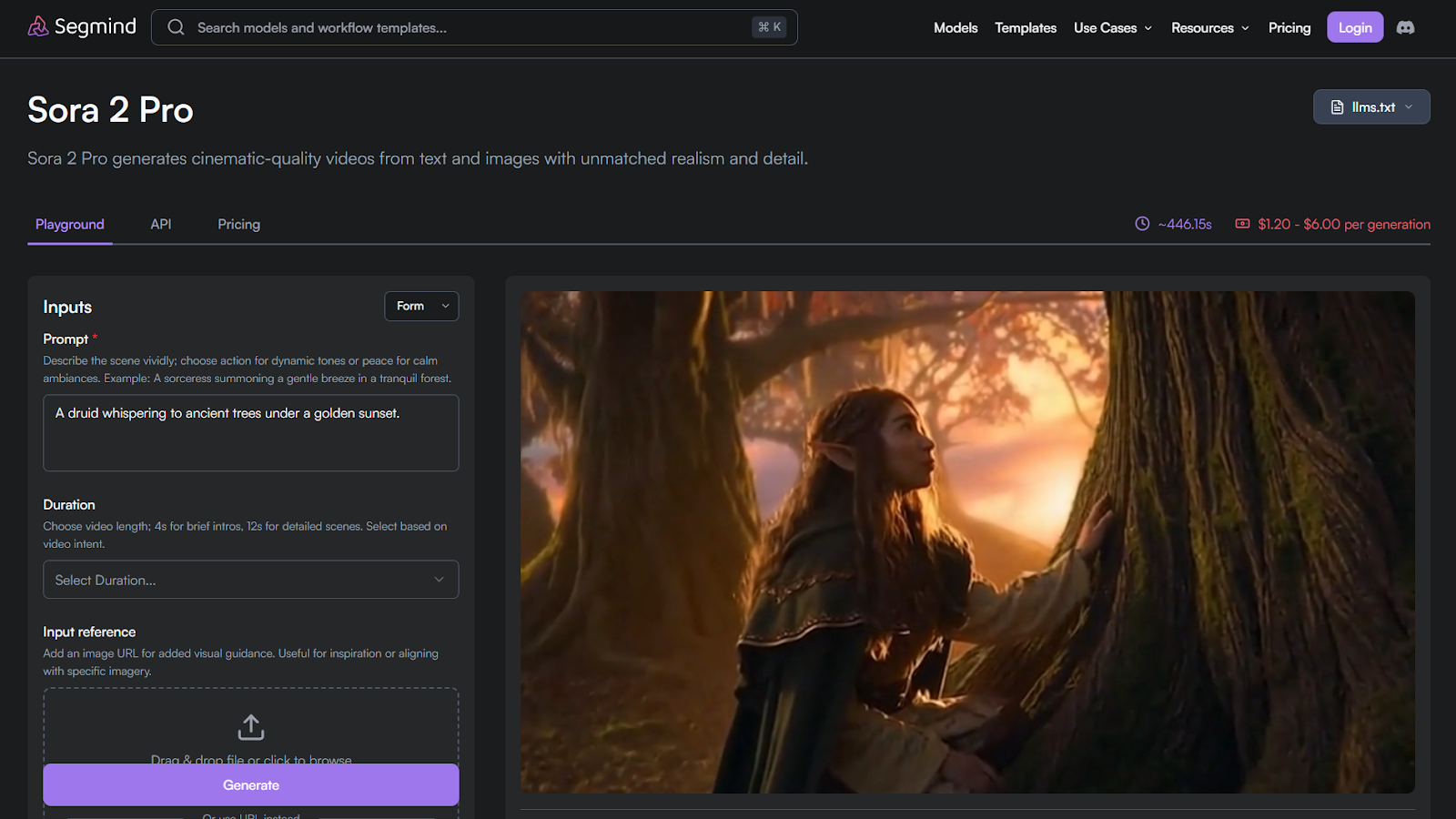 Average Time/Generation on Segmind: ~446.62s | Pricing/Generation on Segmind: $1.20–$6.00 per generation