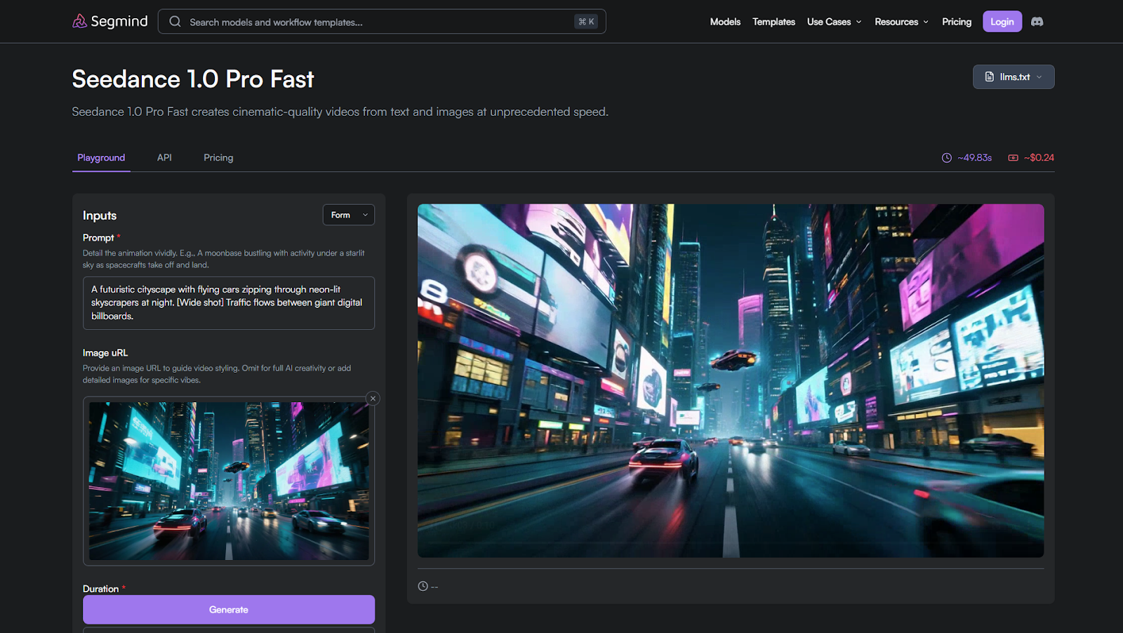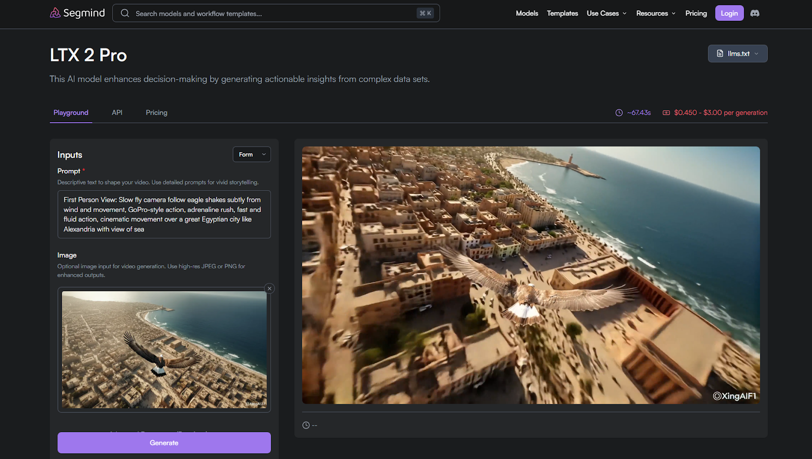 Average Time/Generation on Segmind: 67.08s | Pricing/Generation on Segmind: $0.450–$3.00 per generation