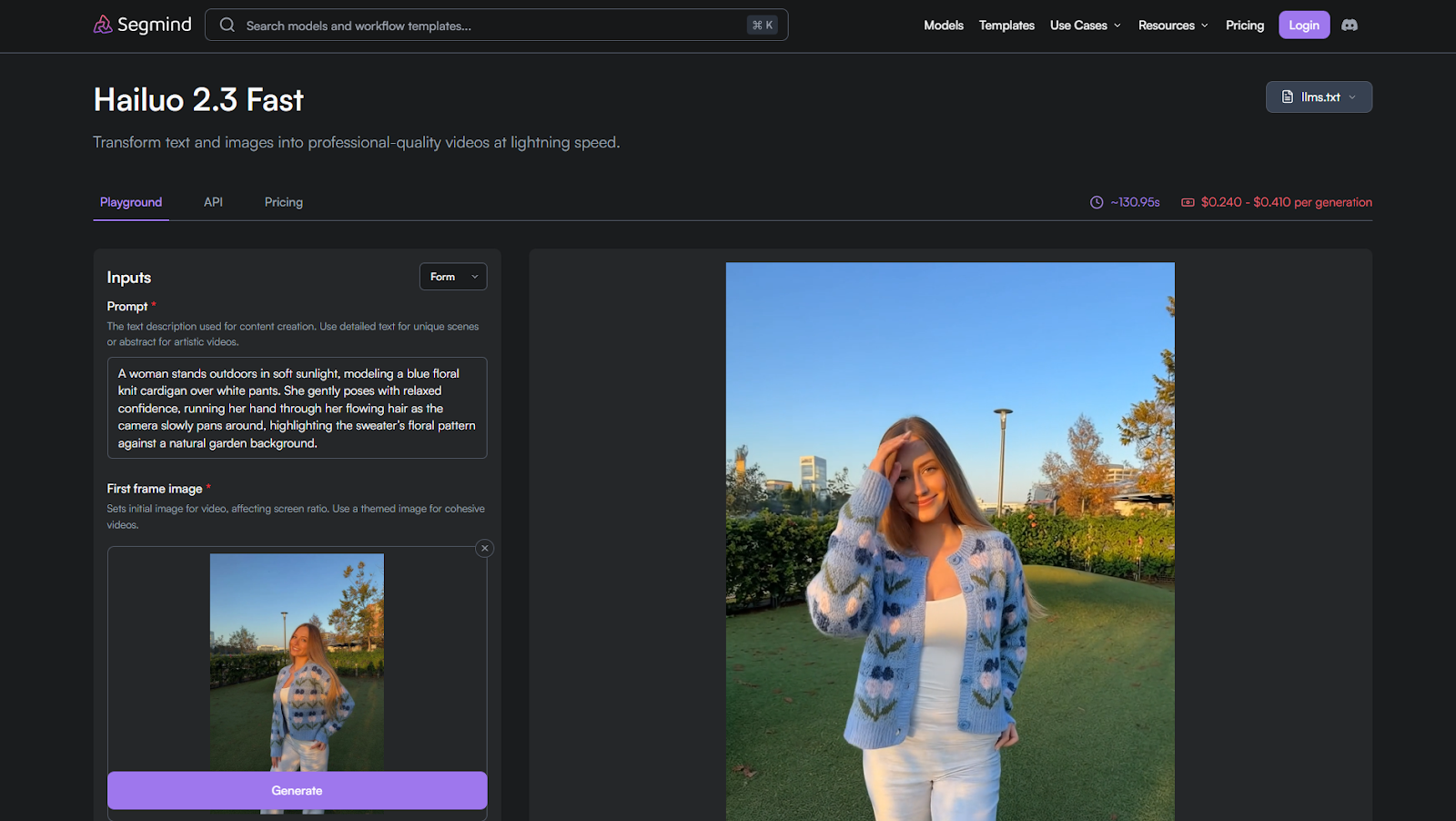 Average Time/Generation on Segmind: ~136.55s | Pricing/Generation on Segmind: $0.240–$0.410 per generation