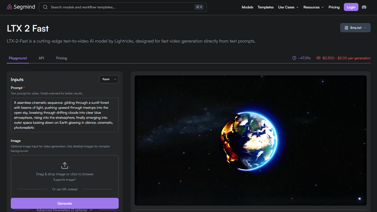 Average Time/Generation on Segmind: ~47.30s | Pricing/Generation on Segmind: $0.300–$2.00 per generation