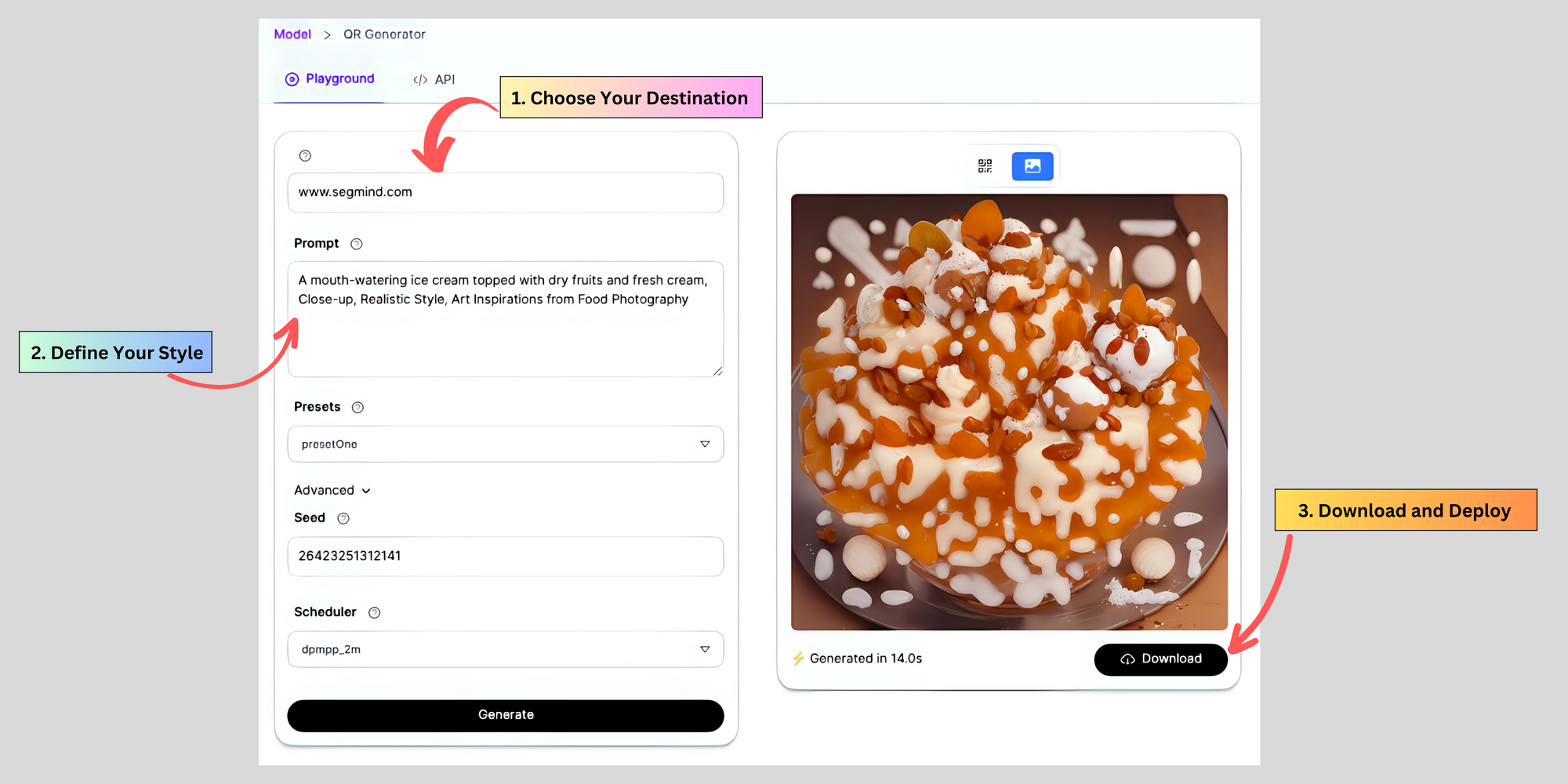 You can create your own custom AI art QR code for your brand using Segmind's QR generator. Here is simple guide to get you started.