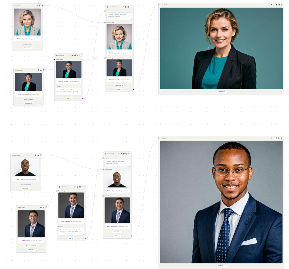 You can create a wide range of profile pictures with different themes, such as LinkedIn profile pictures, Instagram photos, and photos featuring you dressed in different costumes for Comic Con. The possibilities are endless! Here's an example of professional headshots generated for a LinkedIn profile picture, created on Segmind Pixeflow - A no-code GUI for creating Gen AI workflows.