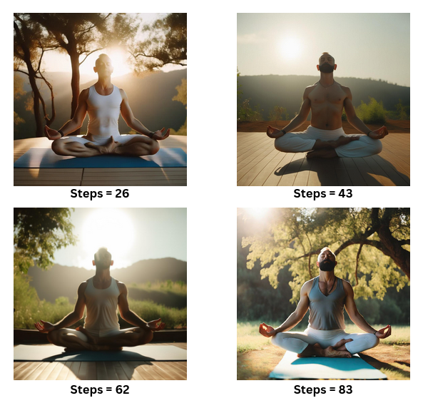 The generation of high-quality images is observed in the range of 50 - 75, beyond this range the number of steps doesn’t seem to alter nor give a significant difference in the overall quality of the images.