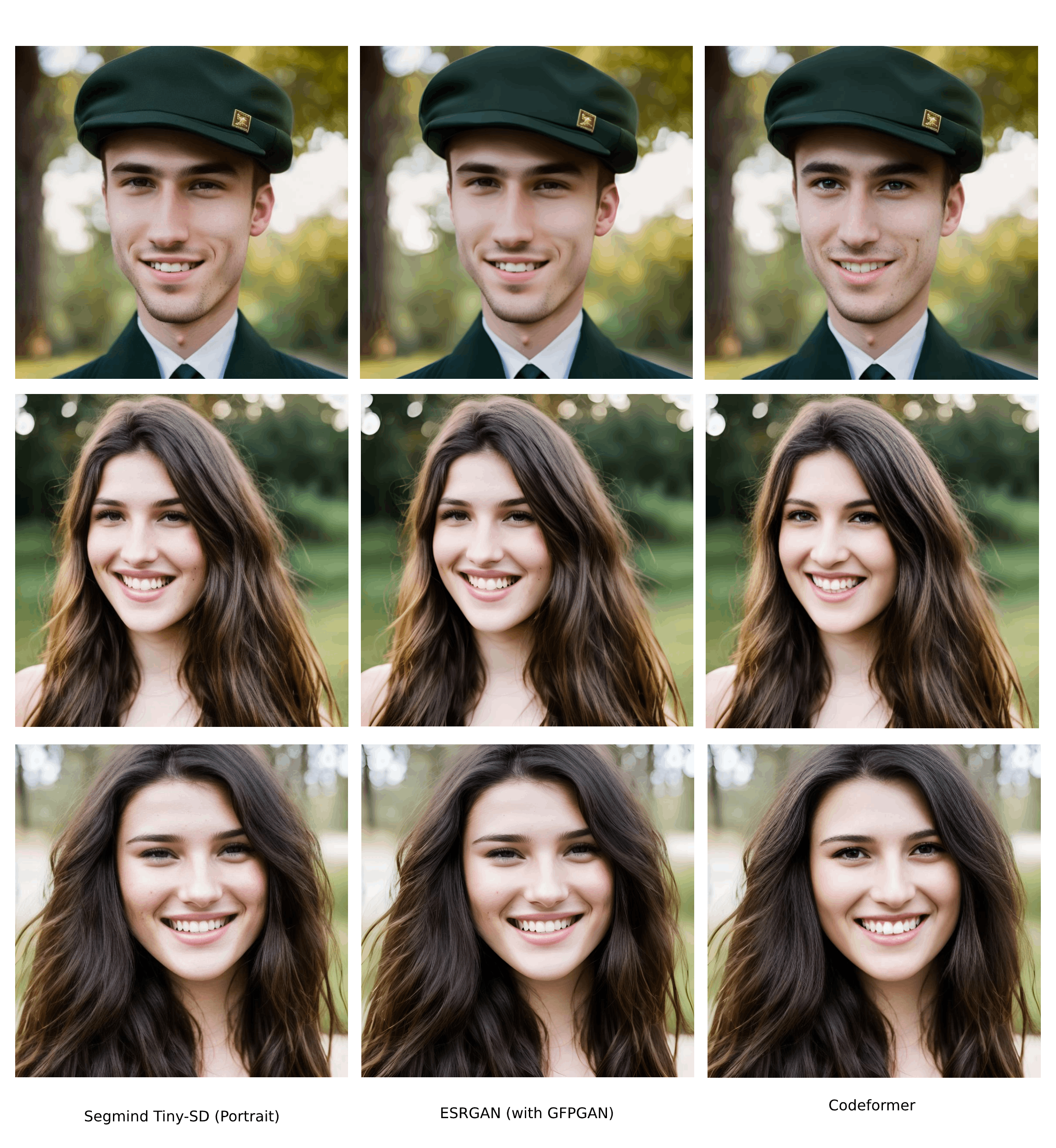 We embarked on an intriguing experiment using the advanced face generator AI model, Segmind Tiny-SD (Portrait), to critically assess and compare the capabilities of ESRGAN and Codeformer in the realm of face restoration. The Segmind Tiny-SD (Portrait) stands out due to its reliance on Knowledge Distillation (KD) in its operational framework. This methodology is reminiscent of a teacher-student relationship where a robust, pre-trained model (acting as the teacher) guides a more compact model (the student) during its training phase. The dataset of choice comprised 7,000 meticulously curated portrait images. The allure of the Segmind Tiny-SD model is not just its efficient size but its promise of delivering results at lightning speed without compromising on the quality of the output. Such attributes deem it perfect for generating faces to test our subjects of interest.