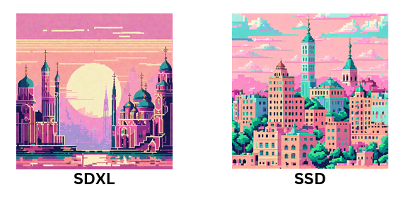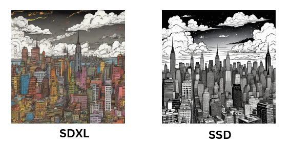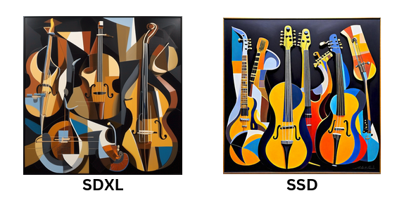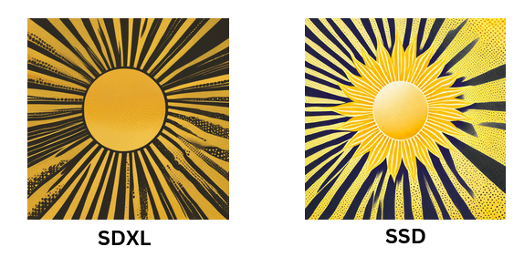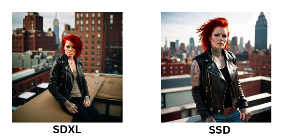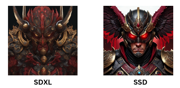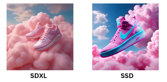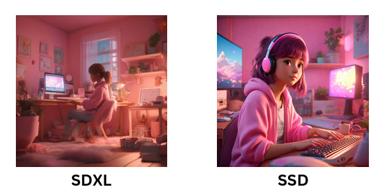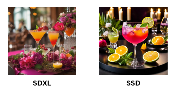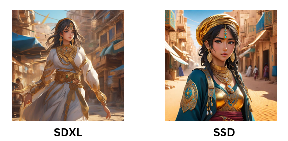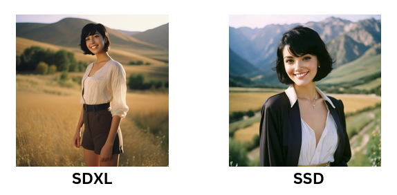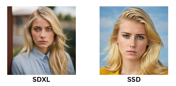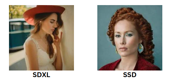 The SDXL Model produces images with a refined and polished appearance, showcasing a high level of sophistication. On the flip side, images produced by the SSD model frequently showcase a vivid and radiant quality.