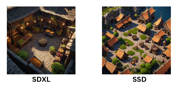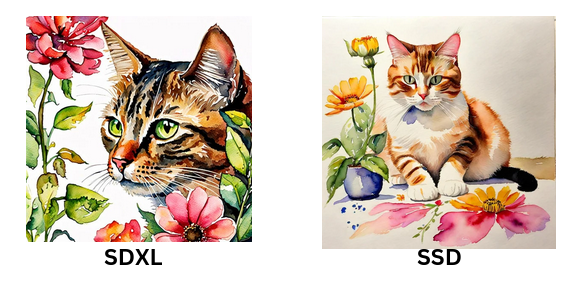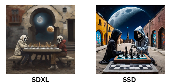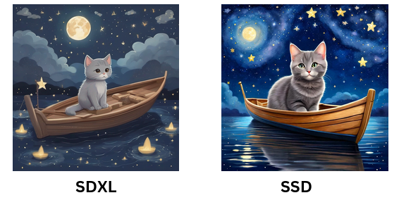 Both models excel at crafting visually striking images based on the given prompts. However, it's worth noting that the SDXL model occasionally struggles to fully adhere to the provided prompts. On the other hand, the images generated by the SSD model not only demonstrate a vibrant quality but are also rich in texture that adds depth and detail to each visual creation.
