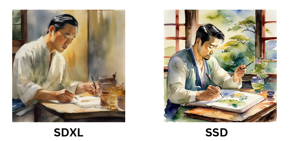 Comparing the images generated by both models, the artistic quality of both images is high. However, the images from SDXL, while maintaining high artistry, exhibit a notable absence of texture and subtle nuances compared to those produced by SSD-1B. The depth in the images appears to be more pronounced in SSD-1B.