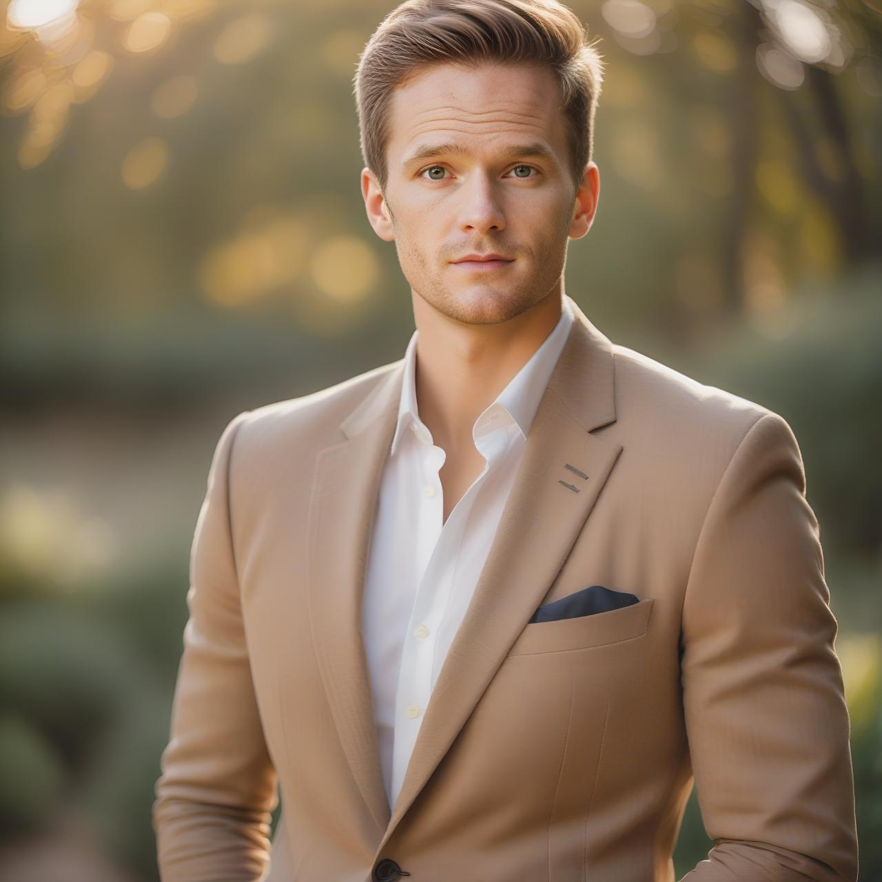 Prompt: "Studio quality headshot portrait photo, smiling, wearing a blazer, outdoors, 35mm photograph, film, bokeh, professional, 4k, highly detailed"