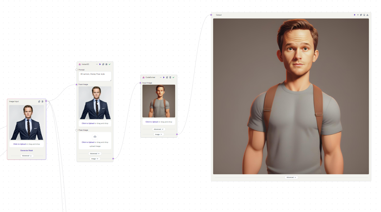 - Pixar Disney Style: We will use InstantID to generate images in the distinctive Pixar Disney style. This could involve creating cartoon-like, vibrant, and expressive images that capture the essence of the individual while reflecting the unique artistic style of Pixar Disney animations.
