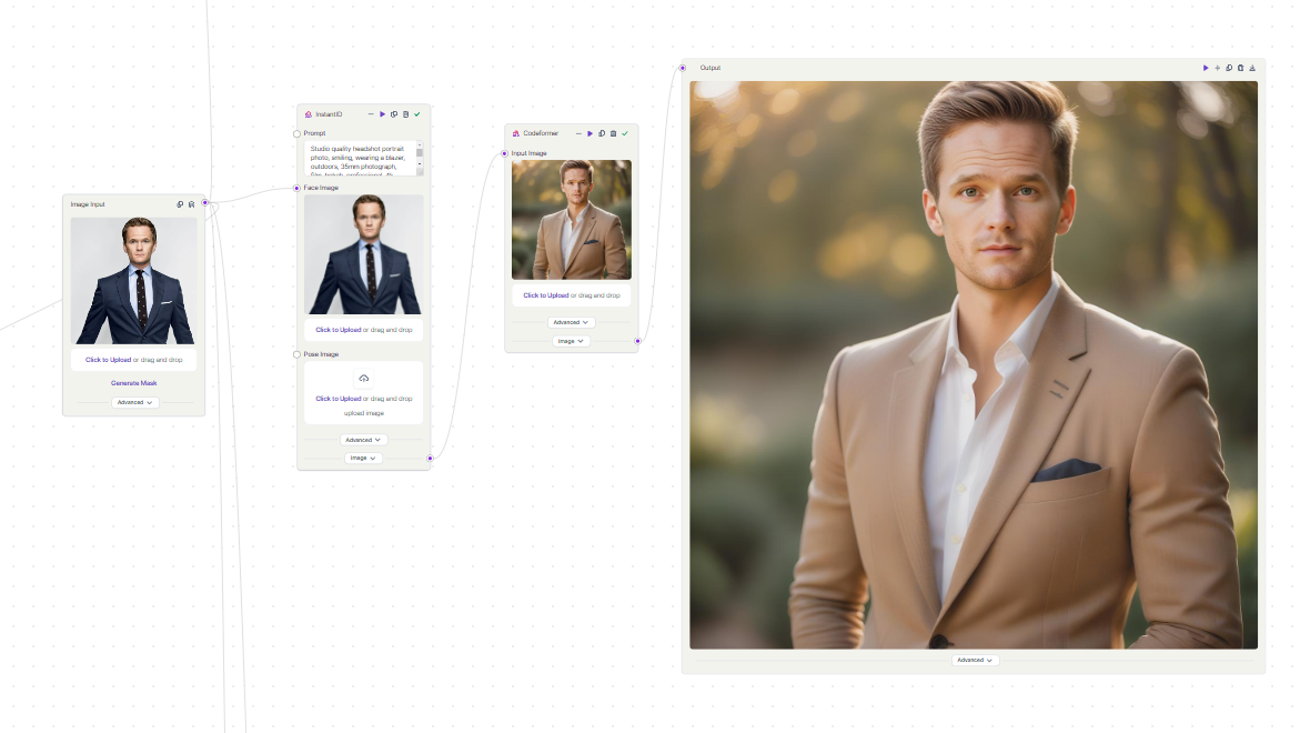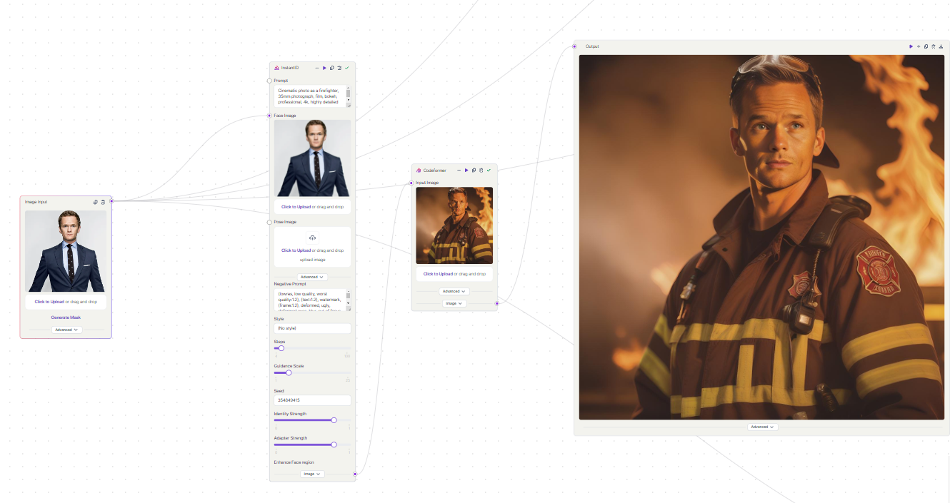 - Finally, upscale with CodeFormer, a robust face restoration algorithm, to enhance the facial features of the generated images.