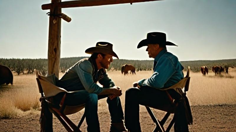 Prompt: two cowboys interacting with each other sitting in a chair, western cinema, cinematic, wide-angle