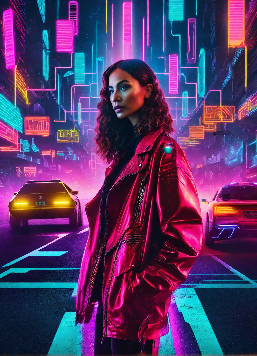Prompt: a woman standing in the road with neon streetlights in the back in a futuristic universe.