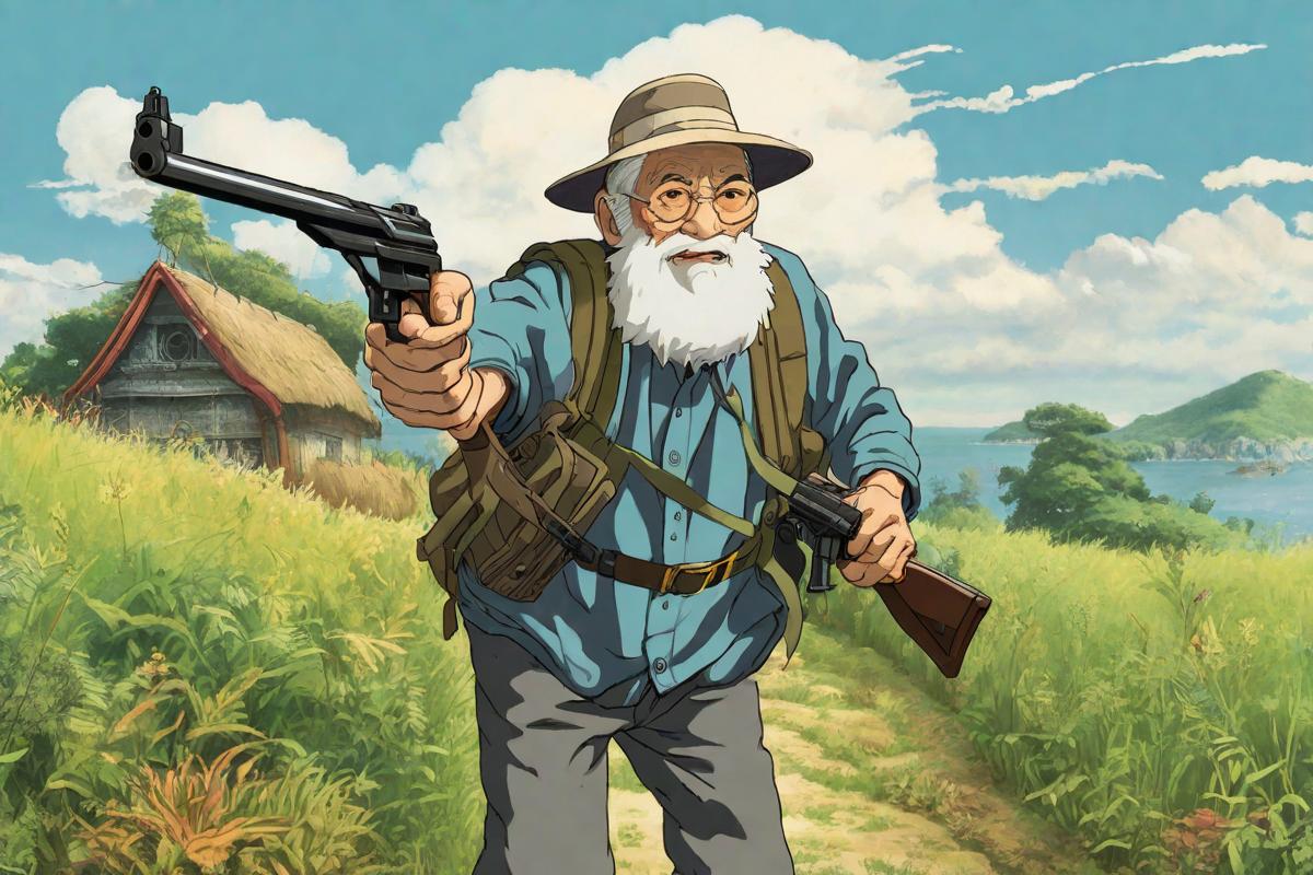 Prompt: An old man with a gun in his hand, Studio Ghibli style, cinematic