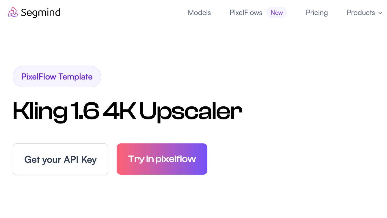 Start creating high-quality 4K videos efficiently by exploring Segmind’s Kling 1.6 4K Upscaler template and experience faster, professional-grade upscaling.