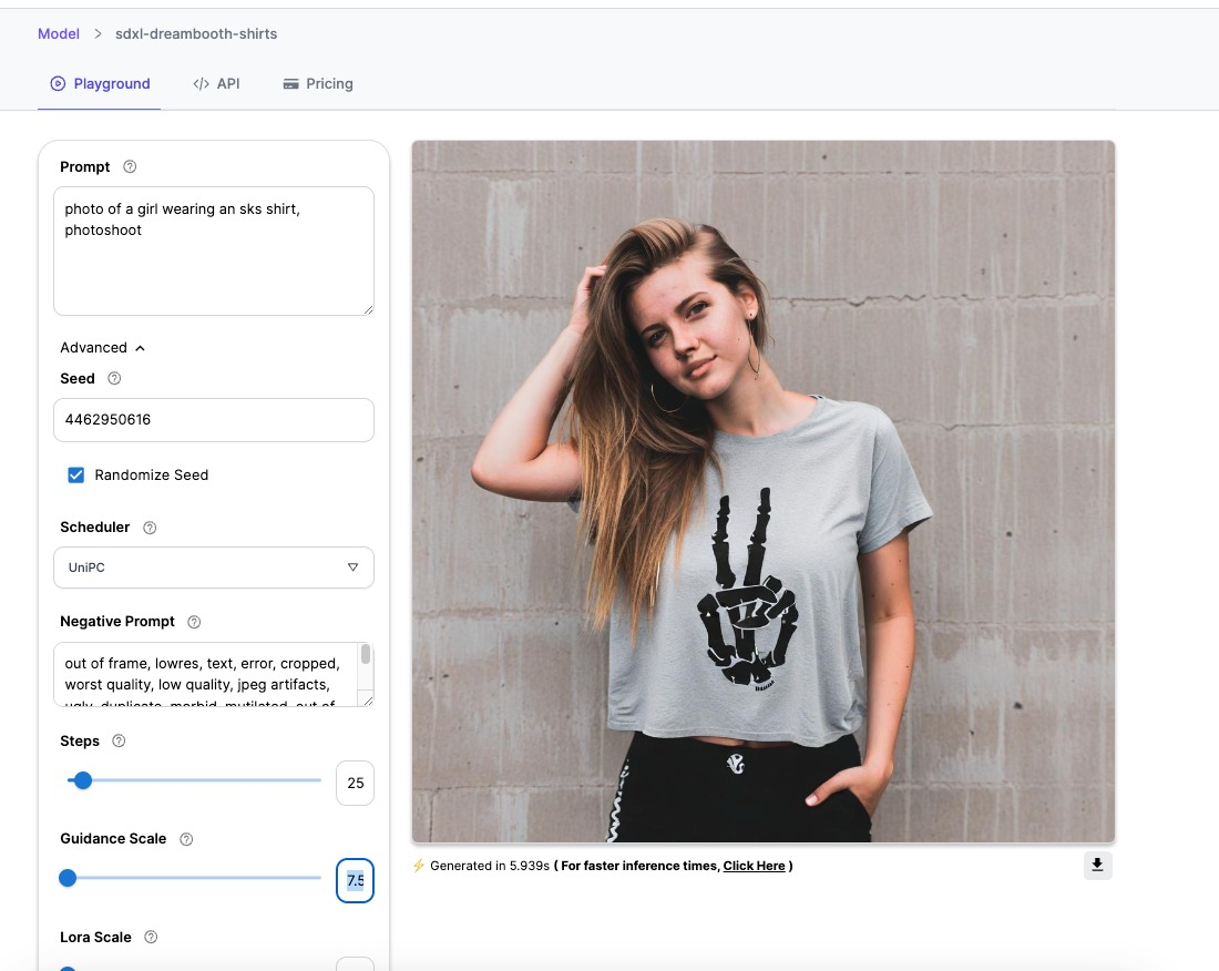 In this tutorial, we delved into the fine-tuning process of SDXL using the DreamBooth technique using AutoTrain library for customized image generation. With a mere five photos as our training dataset, we accomplished the successful training of SDXL. This enables the model to generate a variety of images featuring the shirt in different and creative scenarios.