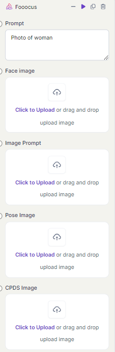 These are the images you will be using as inputs in Fooocus. You can import various types of images such as an image prompt, Face image, Pyracanny, and CPDS depending on the use-case or desired final image output.