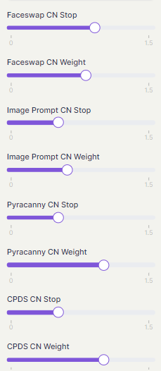 These are the parameters that control the influence of different aspects like Faceswap, Image prompt, Pyracanny, and CPDS on the final output in Fooocus. The extent of this influence is determined by two settings: