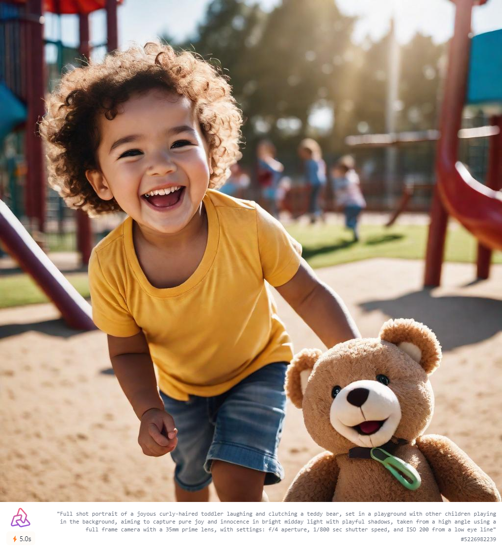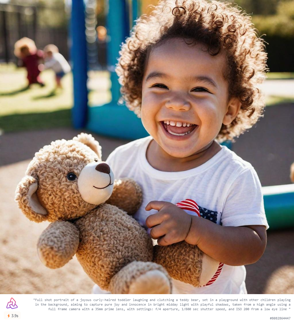 2. [Details & Shot Type]: Curly-haired toddler laughing, clutching a teddy bear; Full Shot