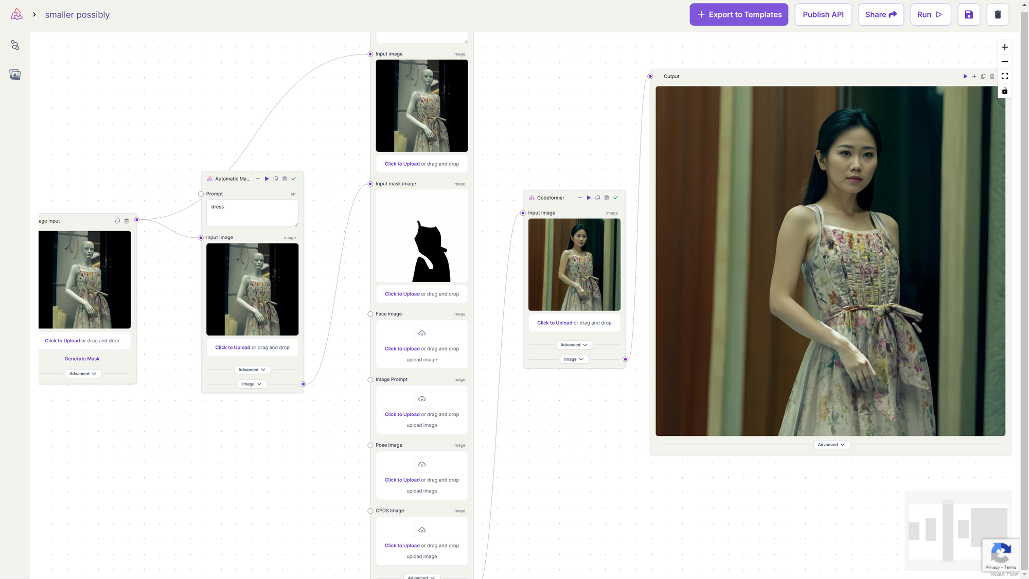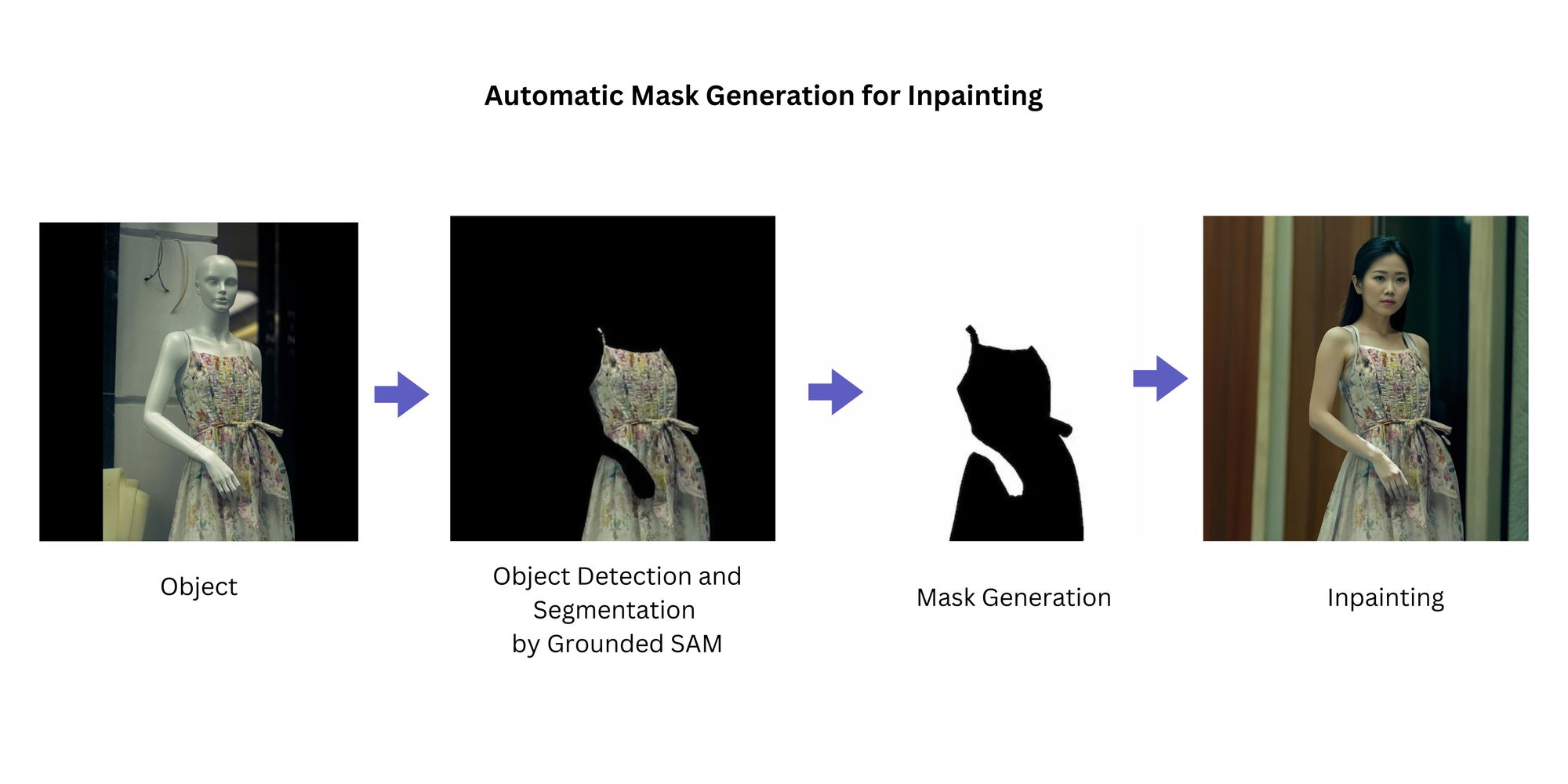 If you want to transform a mannequin wearing clothing into an actual human model wearing the same outfit, explicitly designate the dress as the text prompt in the automatic mask generator. This step ensures an accurate mask is generated specifically for the dress. With the mask in place, you can proceed with inpainting models like Fooocus Inpainting. During inpainting, specify the desired hair color or style as part of the inpainting process. The black pixels (the dress) is preserved, while the white pixels is inpainted.
