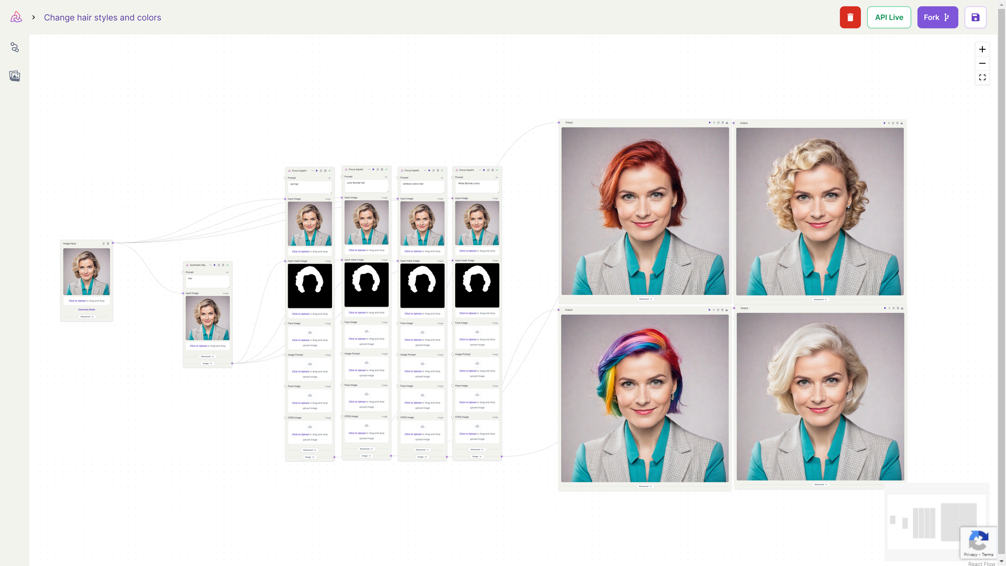 If you want to modify hair (as demonstrated in the workflow below), explicitly designate the hair as the text prompt in the automatic mask generator. This step ensures an accurate mask is generated specifically for the hair. With the mask in place, you can proceed with inpainting models like Fooocus Inpainting. During inpainting, specify the desired hair color or style as part of the inpainting process. The black pixels (human) is preserved, while the white pixels is inpainted (the hair).