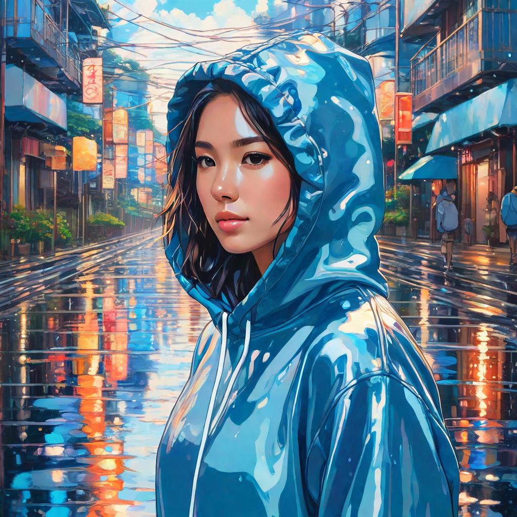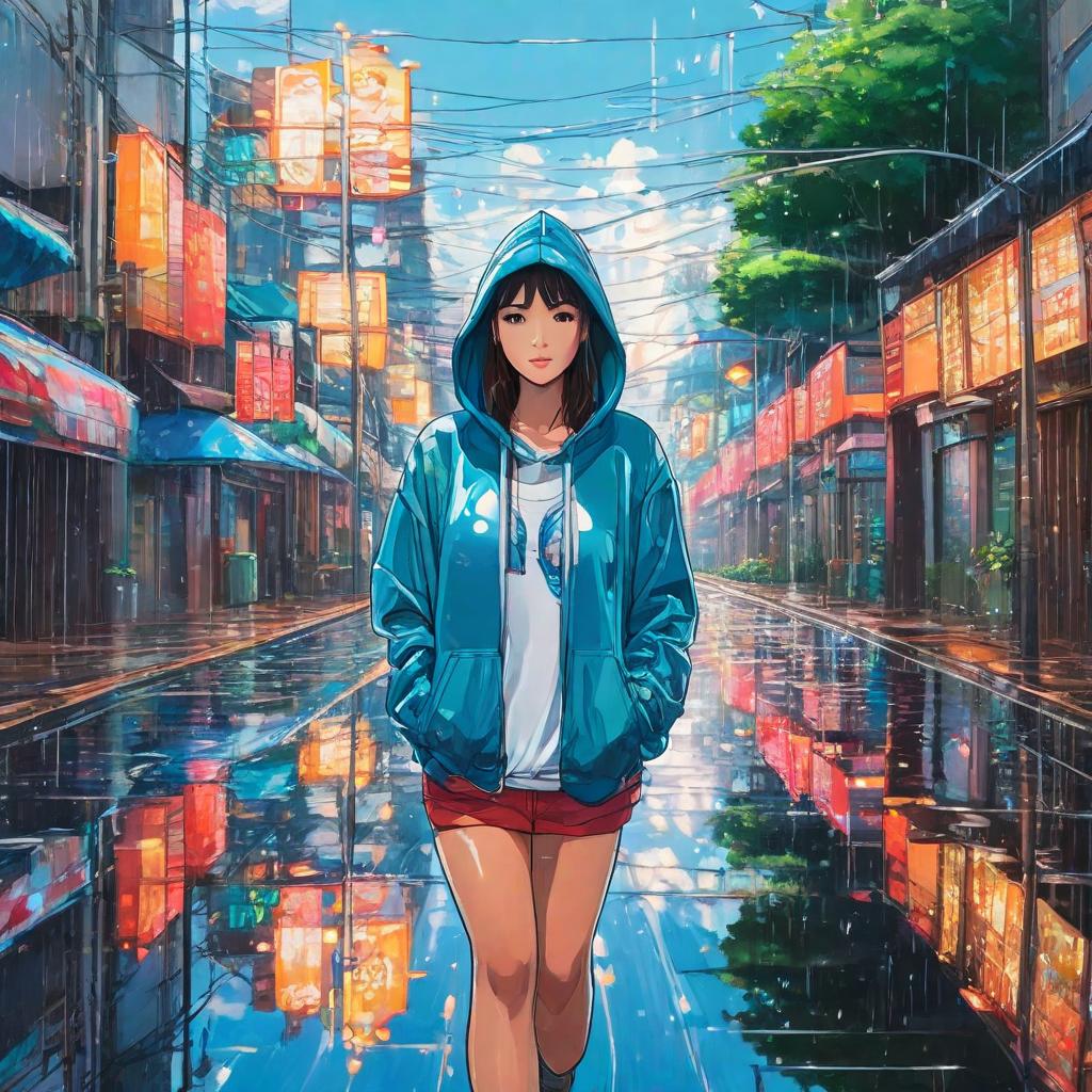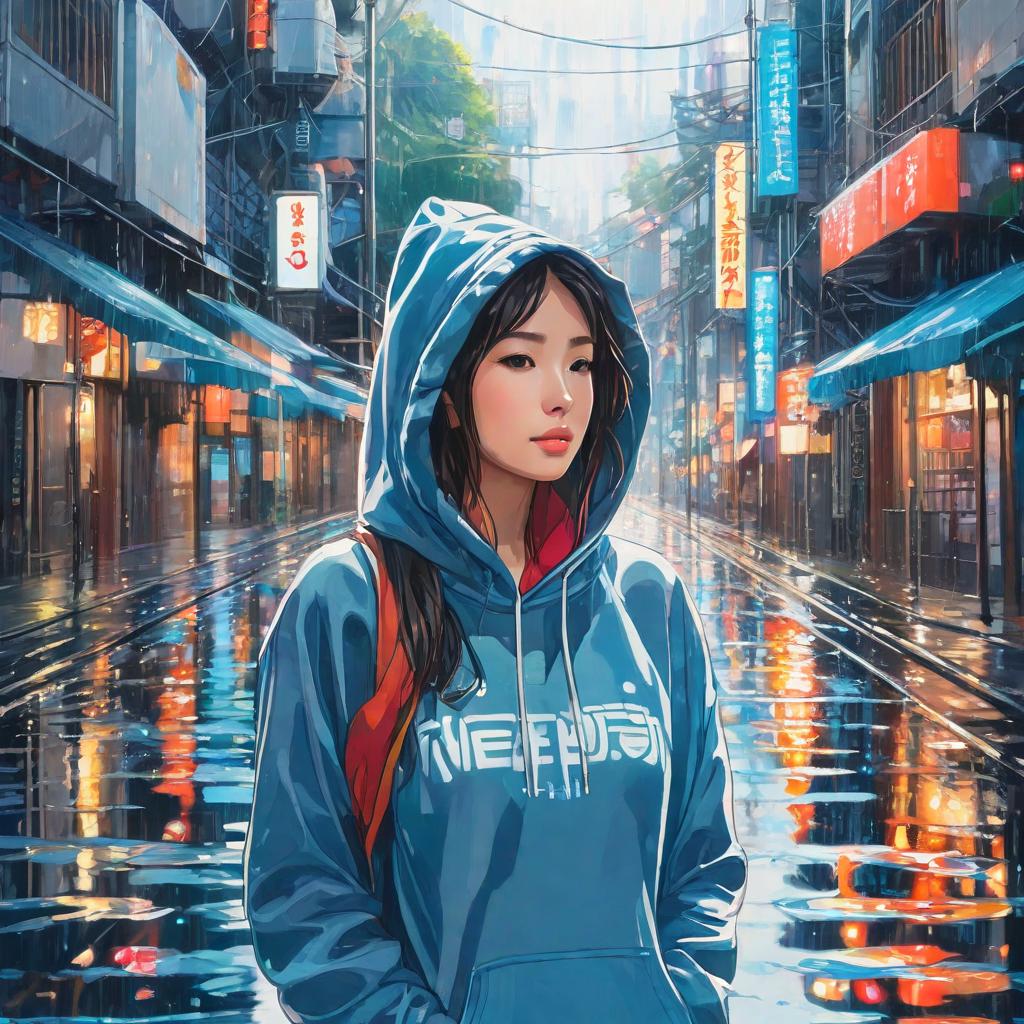 Prompt: photo portrait of a stunning woman wearing a hoodie and walking down the road , wet reflections , highly detailed studio Ghibli, acrylic palette.
