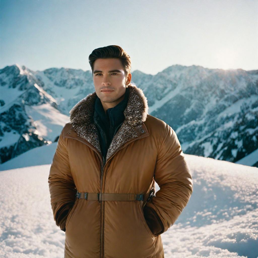 Prompt: Handsome man standing in snowy mountain with perfect lighting , shot on Arri alexa 35 in kodak potra 400 film