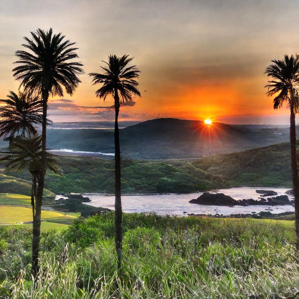 - Seed 2: Using the second seed setting with the same ‘sunset’ prompt, the model might generate a slightly different image. The foreground now consists of tall palm trees surrounded by lush greens against a vibrant sunset sky . The scene also features a body of water with rocky outcroppings.