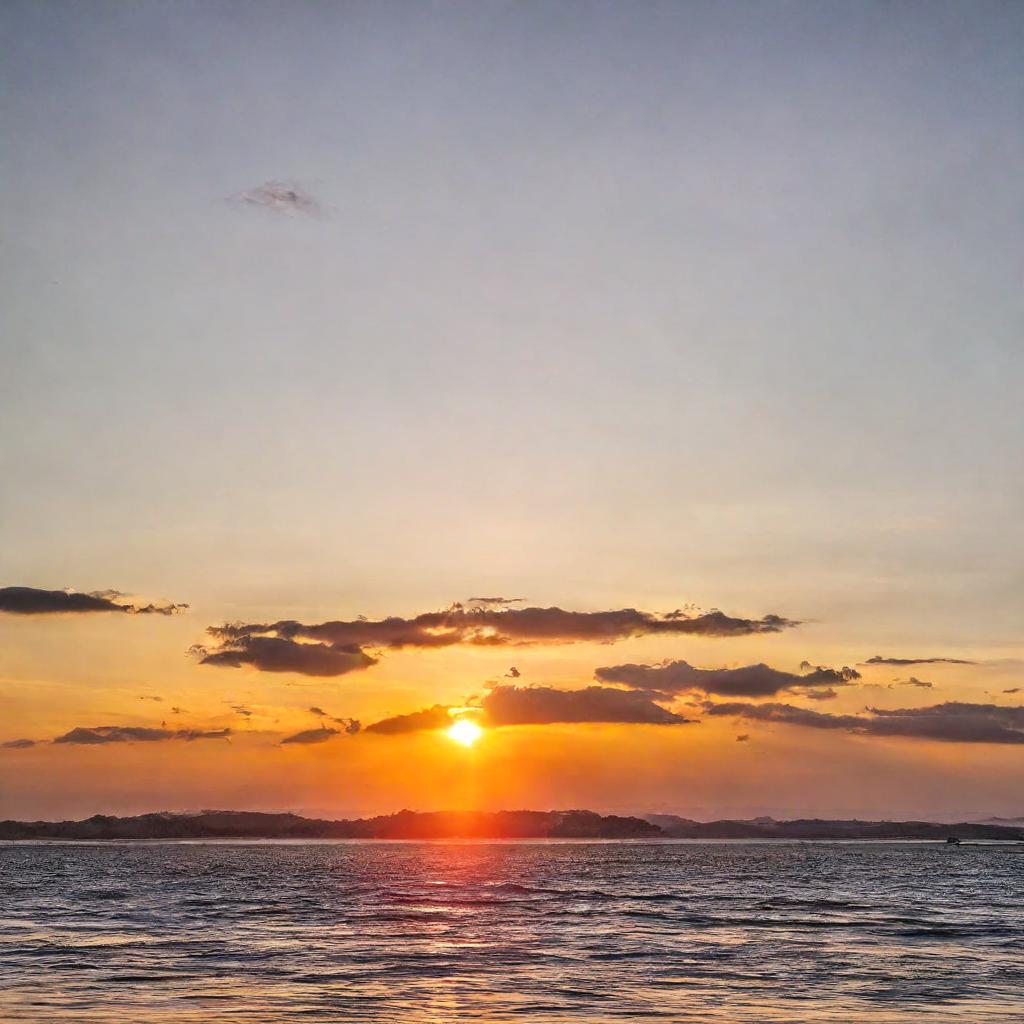 - Seed 3: With the third seed setting, the image generated different again. The image shows a vibrant orange sun low on the horizon, partially obscured by clouds. The sky is filled with scattered clouds tinged in shades of orange, pink, and grey from the setting sun's rays.