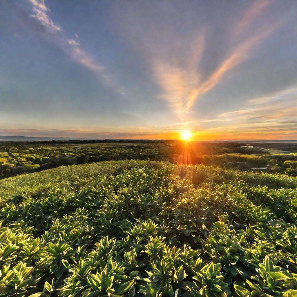 - Seed 1: With the first seed setting, the model looks like natural photograph captured during a beautiful sunset over a vast landscape. The foreground tends to feature a field of meadow filled with lush greens and is bathed in a warm golden light of the setting sun. The sun itself is prominently visible casting long shadows across the scene.