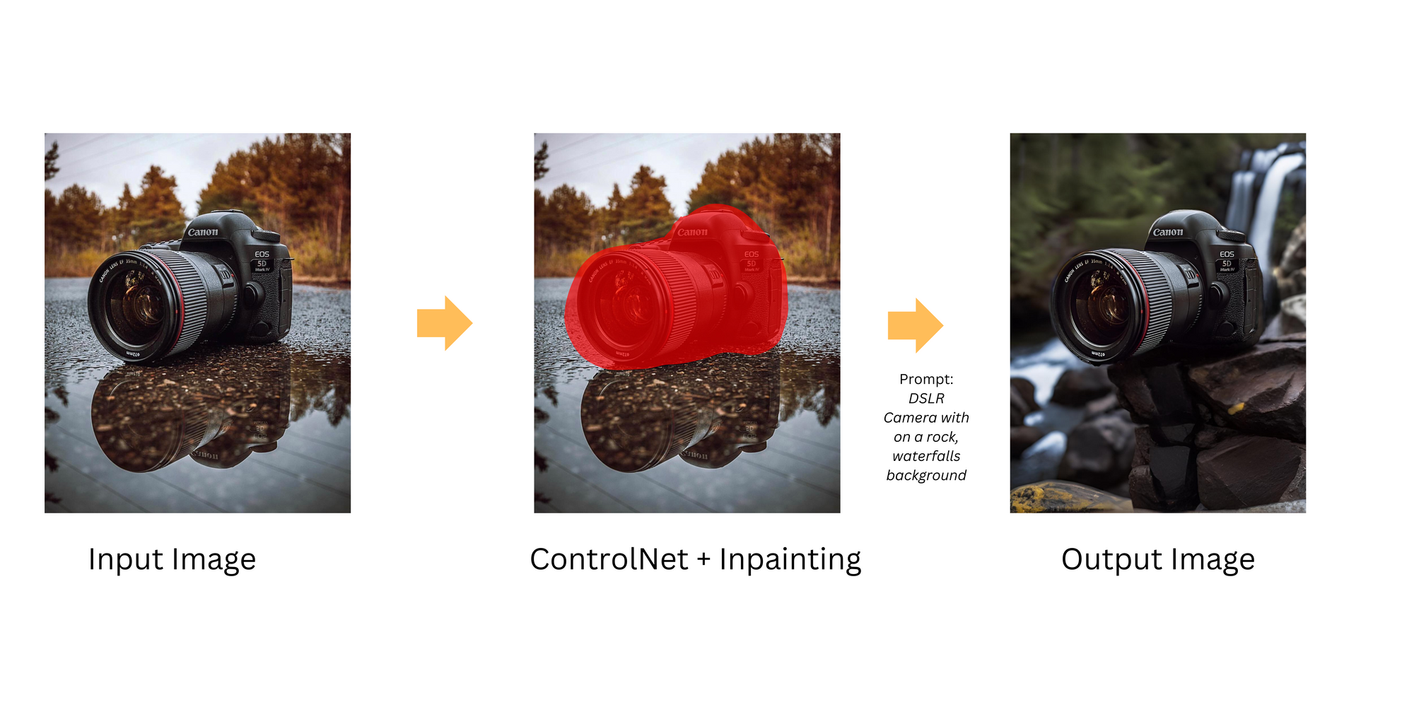 In AI product photography can be achieved with something called ControlNet Inpainting. The process begins with the creation of an 'inpaint mask', which plays a pivotal role in identifying and isolating the product within the image. This mask delineates the product, protecting it from any modifications, while marking everything outside it as the background, ready for alteration. Once this mask is established, ControlNet comes into action, discerning the distinction between the foreground (the product) and the background. Leveraging this insight, ControlNet then embarks on 'inpainting' – a process of reconstructing the background in a new form, ensuring the product's integrity remains intact. This method allows for a seamless transformation of the backdrop while keeping the product as the focal point, untouched and unchanged. This way AI seamlessly integrates the product into various backgrounds or settings. The result is a series of images where the product remains consistent, but the environment around it changes, offering diverse and contextually relevant visuals.
