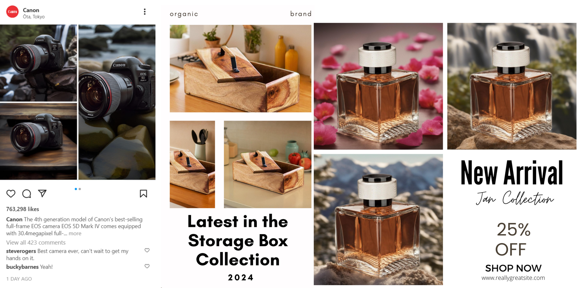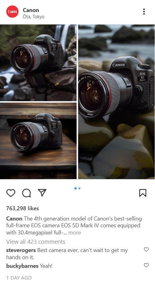 AI-generated product images of DSLR cameras can be swiftly adapted for various marketing campaigns. Whether it's a product launch, a seasonal promotion, or a special edition release, AI allows for rapid adjustments to suit the campaign's theme. Leveraging AI-generated product images, advertising and design teams can rapidly and efficiently create social media promotions, like the one below: a fictitious Instagram post made for a Canon DSLR camera.