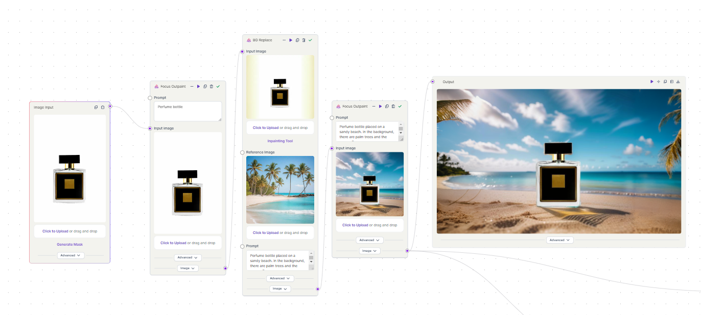Generate Background for the Perfume Bottle: The first step involves generating a background for the perfume bottle image. This is done using an image-based generative AI model, which uses ControlNet Inpainting along with an Image Prompt. The model takes as input text prompt describing the perfume bottle in a beach scene and an image prompt of a beach, and generates a background image in response. In this case, a beach background is generated, giving the perfume bottle an overall beach theme.