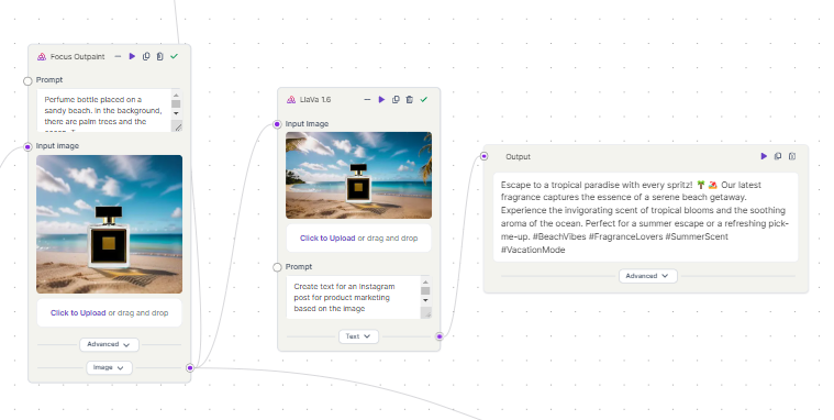 Putting It All Together: Finally, all these elements are combined to create an end-to-end social media promotional campaign. With a single click, you can generate a detailed a themed product image, text for a promotional Instagram post, and a short promotional video. This streamlined workflow can greatly assist ecommerce brands in their social media marketing efforts.