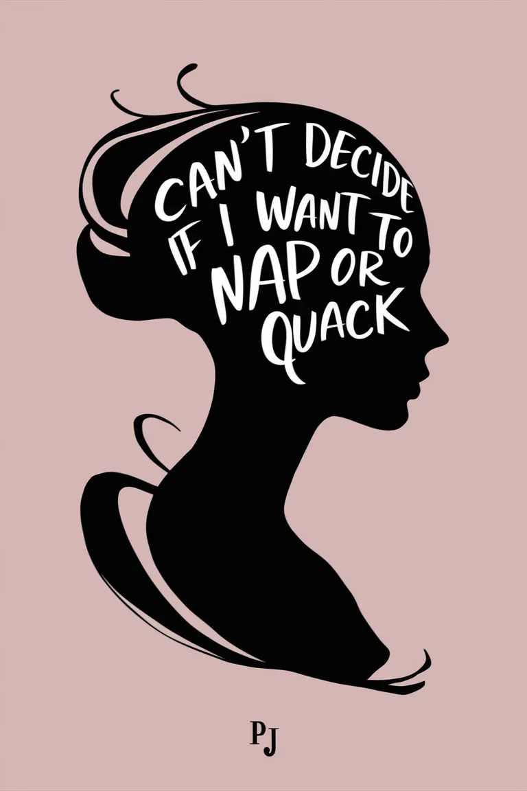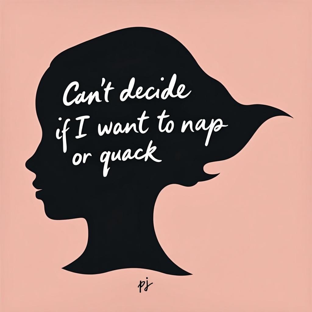 Ideogram (L), Flux.1 (R) Prompt: A captivating minimalist illustration features a bold, fluid silhouette of a woman's profile, intricately rendered in elegant black ink. The strong yet feminine form stands out against a soft blush pink background, creating a visually striking and graceful composition. The hollow head is filled with a playful, white text that reads, "Can't decide if I want to nap or quack," adding a humorous twist and making the image a tongue-in-cheek exploration of desires and whims. The simplicity of the design is perfectly balanced by the cheeky message, inviting a smile from the viewer. The artist's initials "PJ" are discreetly signed at the bottom in small letters, adding a personal touch to the digital art piece., typography, illustration