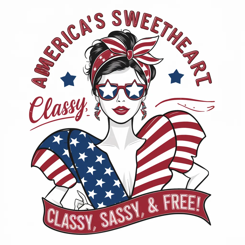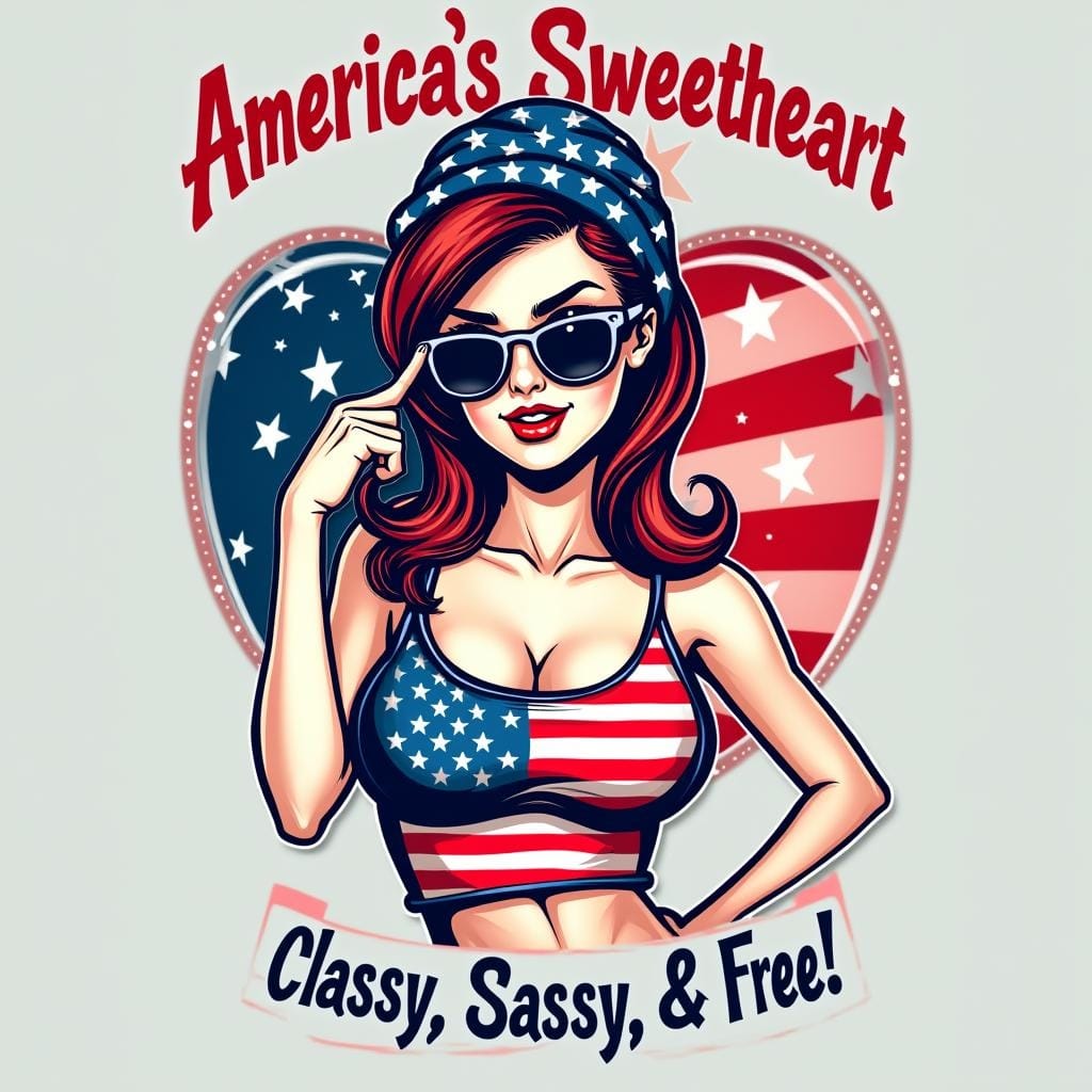 Ideogram (L), Flux.1 (R) Prompt: "A chic and playful T-shirt design featuring a confident, stylish woman donning an American flag-inspired outfit. She sports sunglasses and a patriotic bandana, embodying a unique blend of class, sass, and love for her country. The text "America's Sweetheart" adorns the top of the design, while the pun "Classy, Sassy, & Free!" proudly stands out below. The combination of grace, independence, and patriotism is evident in this bold and charming design, perfect for those who proudly embrace their American roots with a touch of sassiness"