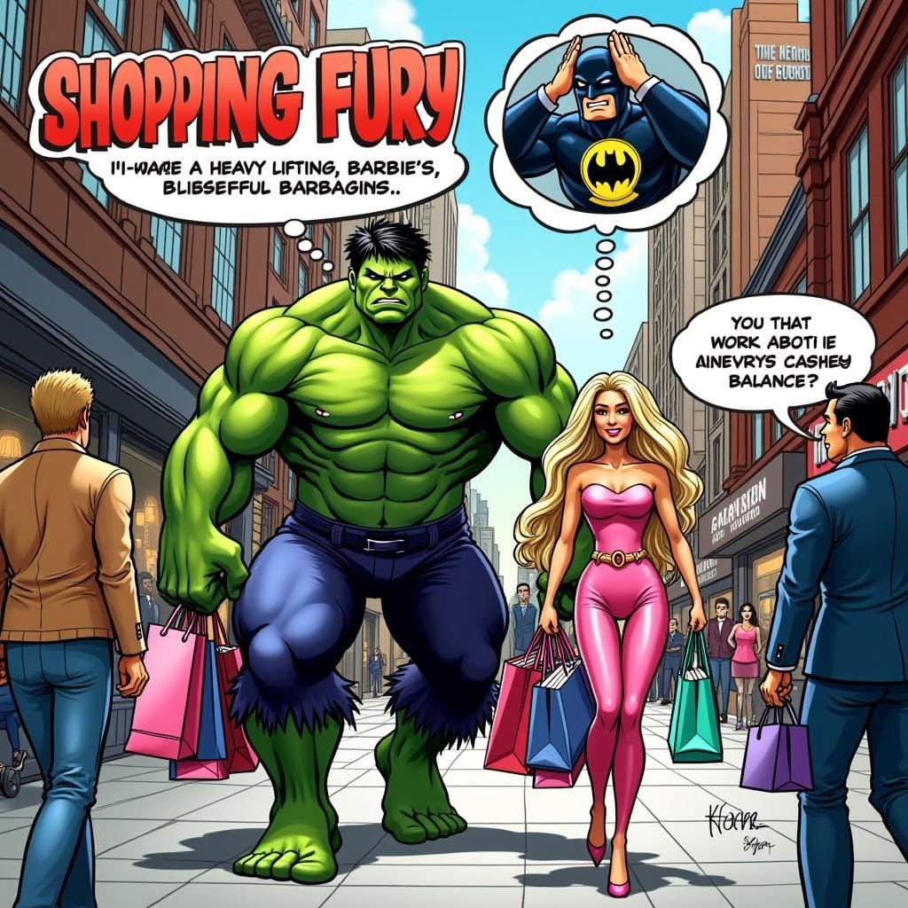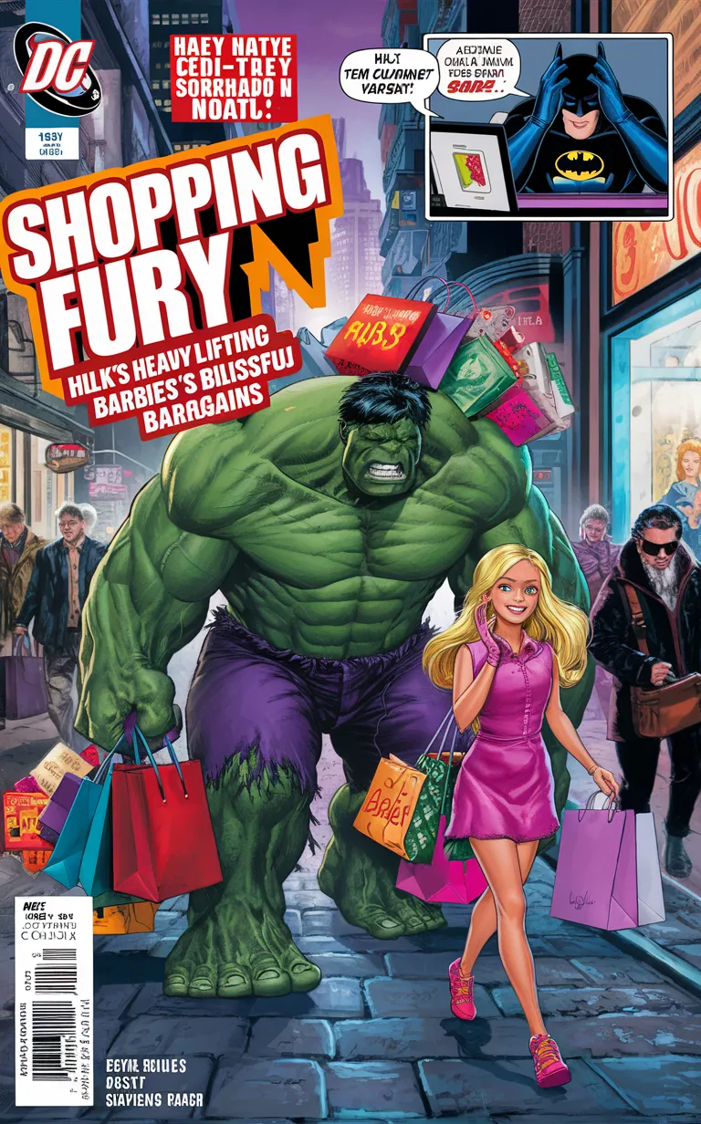 Ideogram (L), Flux.1 (R) Prompt: Create a comic book cover that captures the comedic clash between Hulk and Barbie's contrasting lifestyles. The title should be prominent and rendered in a bold, eye-catching font consistent with comic book branding. Cover Title: "Shopping Fury: Hulk's Heavy Lifting, Barbie's Blissful Bargains". Illustrate Hulk in a busy New York street filled with shops, struggling and barely managing to carry dozens of shopping bags and packages purchased by Barbie. Barbie walks in front of him, smiling and chatting on her phone, already thinking about her next purchases. In a panel at the top corner, depict Batman with a look of shock, hands on his head, staring at his computer monitor where the display shows his credit card balance at zero. The background should show vibrant city life and stylish storefronts, emphasizing the bustling shopping scene. The cover should exude a classic comic book aesthetic with bold, dynamic lines and vibrant colors. Thought bubbles and captions should further enhance the humor and absurdity of the situation, adding depth to the characters and storyline. Illustration.