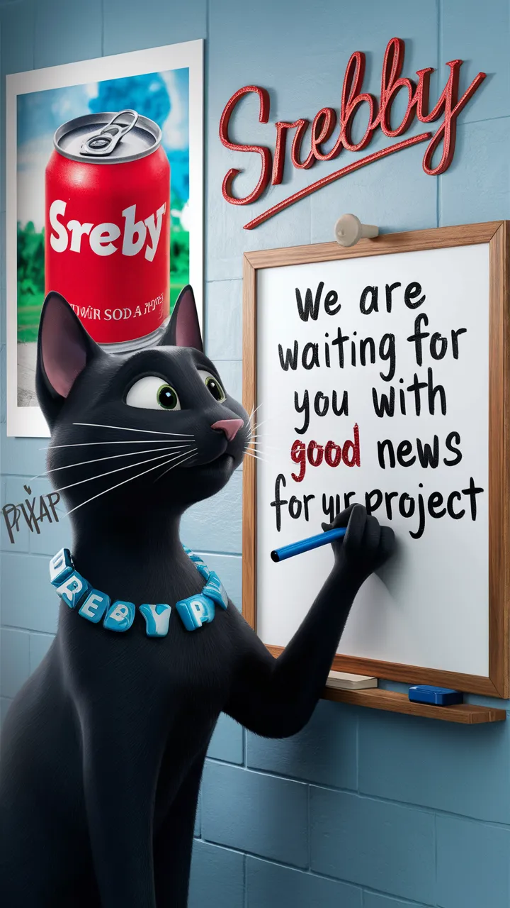 Ideogram (L), Flux.1 (R) Prompt: A captivating 3D Pixar-style illustration featuring a sleek black cat wearing a blue necklace with the name "Papy" engraved on it. The cat is standing in front of a wall adorned with a photo of a charming red soda can labeled "Srebby". The cat is writing a message on a whiteboard, which reads, "We are waiting for you with good news for your project". The typography is creative and eye-catching, and the overall scene is a perfect blend of 3D, illustration, and typography., typography