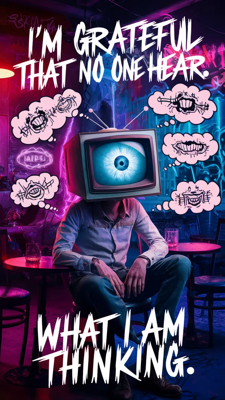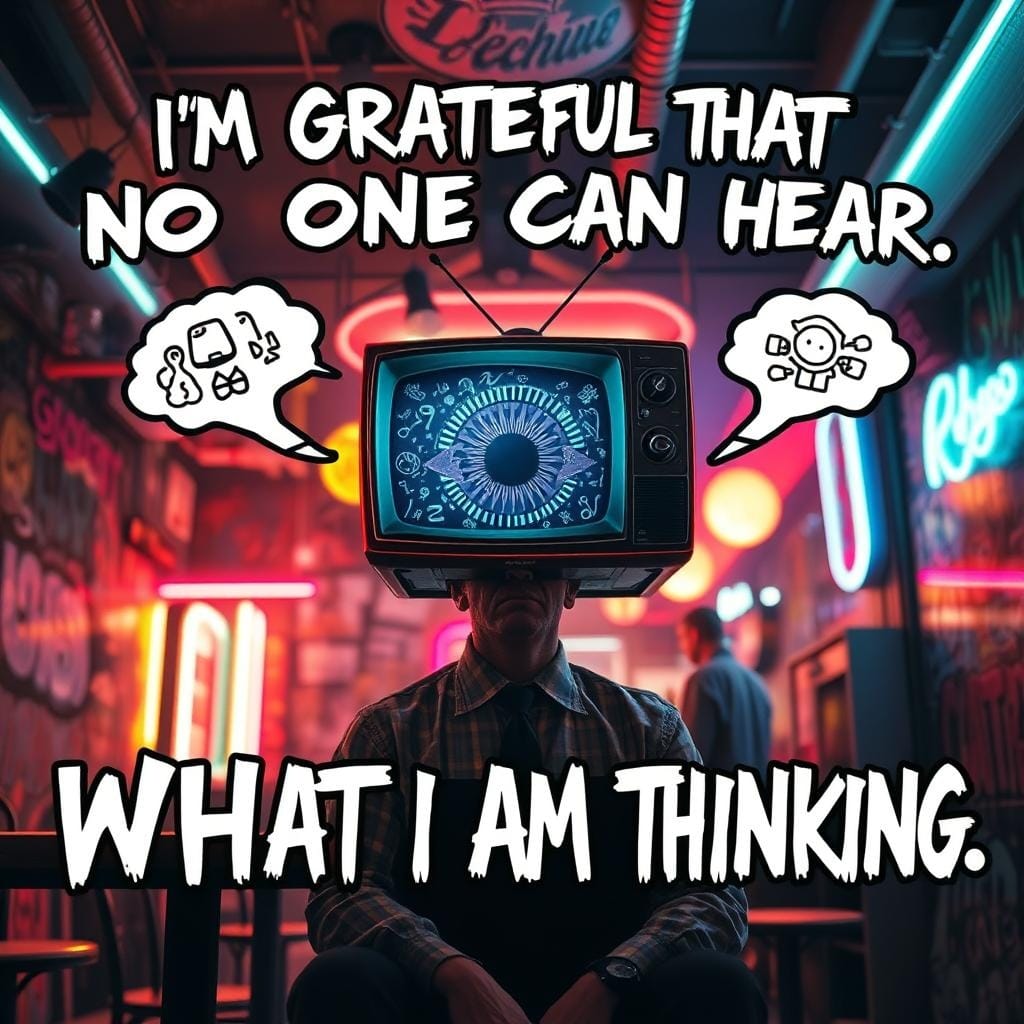 Ideogram (L), Flux.1 (R) Prompt: A wildly unhinged conceptual art piece set in a chaotic, neon-lit cafe. The main character, a man with a retro television for a head displaying a large, glowing eye, sits alone, surrounded by thought bubbles filled with the chaotic symbols. The text "I'M GRATEFUL THAT NO ONE CAN HEAR" at the top and "WHAT I AM THINKING." at the bottom, both in jagged, white capital letters with a black outline, float around the scene. The background is a blend of neon lights, cafe ambiance, and graffiti elements, highlighting the character's mischievous inner world., typography, cinematic, conceptual art