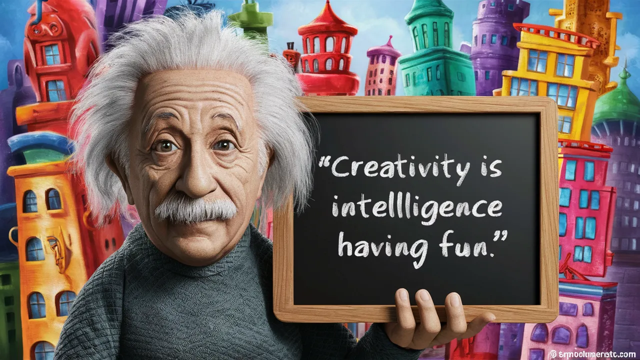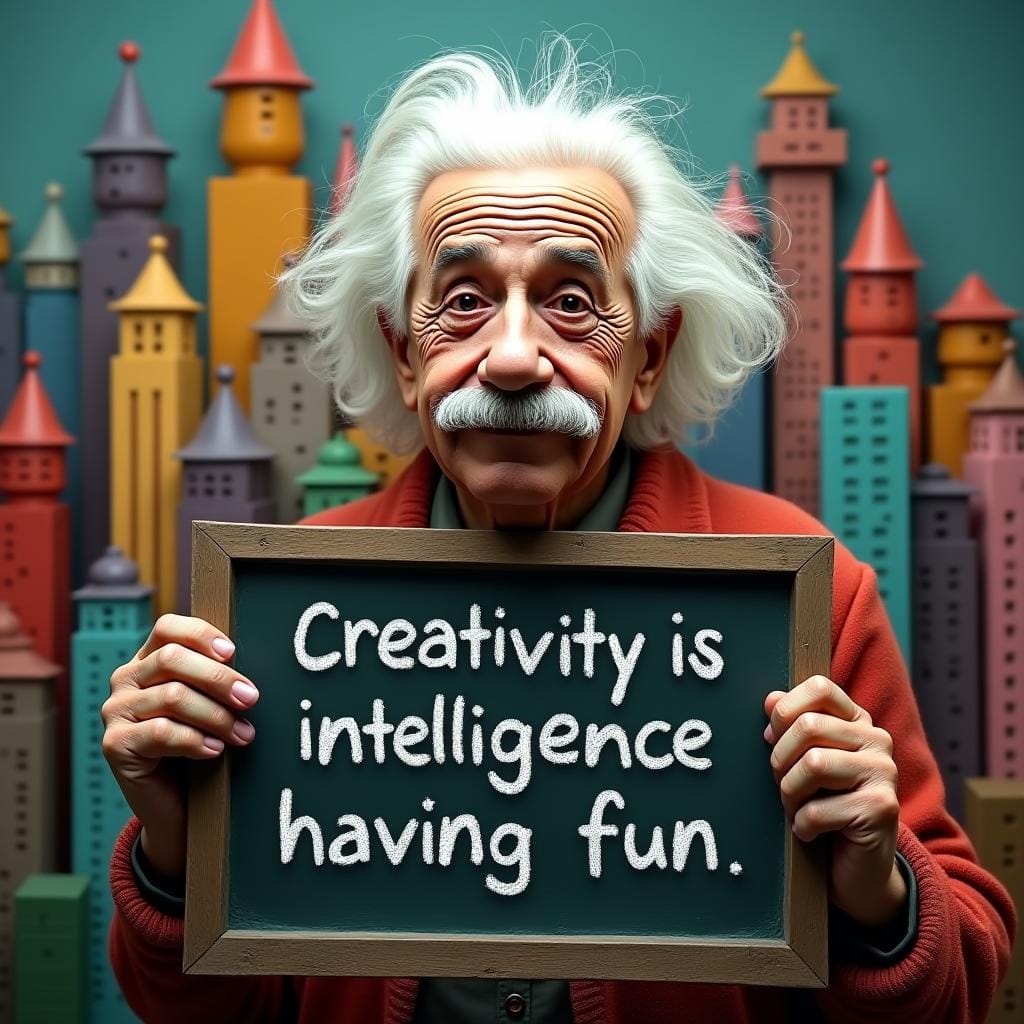 Ideogram (L), Flux.1 (R) Prompt: "An amusing meme displaying Albert Einstein's face, with the quote "Creativity is intelligence having fun" written on a chalkboard in his hand. Behind him, there's a colorful, vibrant cityscape with buildings of various shapes and designs, indicating the limitless potential of human creativity. The overall atmosphere of the image is lighthearted and whimsical, emphasizing the joy of unleashing one's imagination"