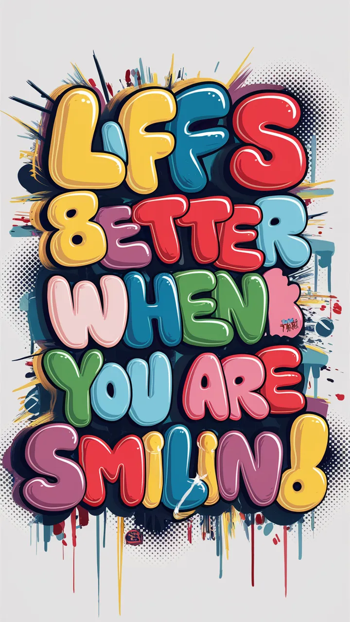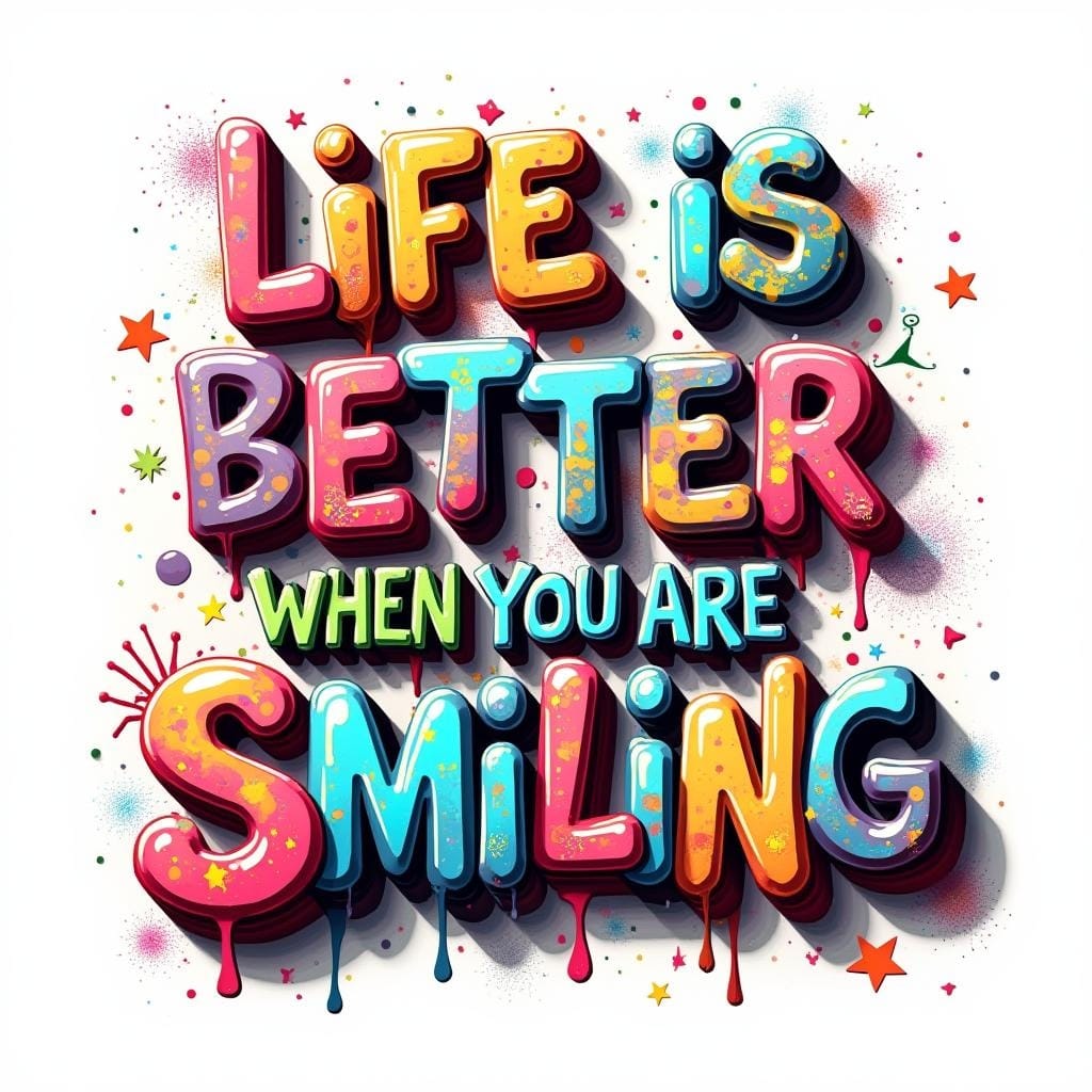 Ideogram (L), Flux.1 (R) Prompt: A captivating 3D typography illustration that vividly spells out "LIFE IS BETTER WHEN YOU ARE SMILING ". The bold, graffiti-inspiredbubble letters are rendered in an eye-catching array of colors, each uniquely shaped and featuring playful designs. The energetic and lively visual effect is further enhanced by realistic street art elements, such as paint drips and splatters, as well as halftone dots that add depth and texture. The illustration is framed by a pristine, white background that accentuates the colors and shapes, transforming this dynamic and visually stimulating spectacle into a truly unforgettable piece of art., vibrant, typography, illustration