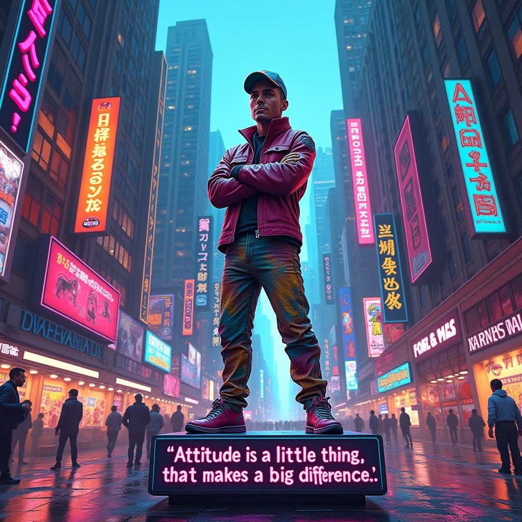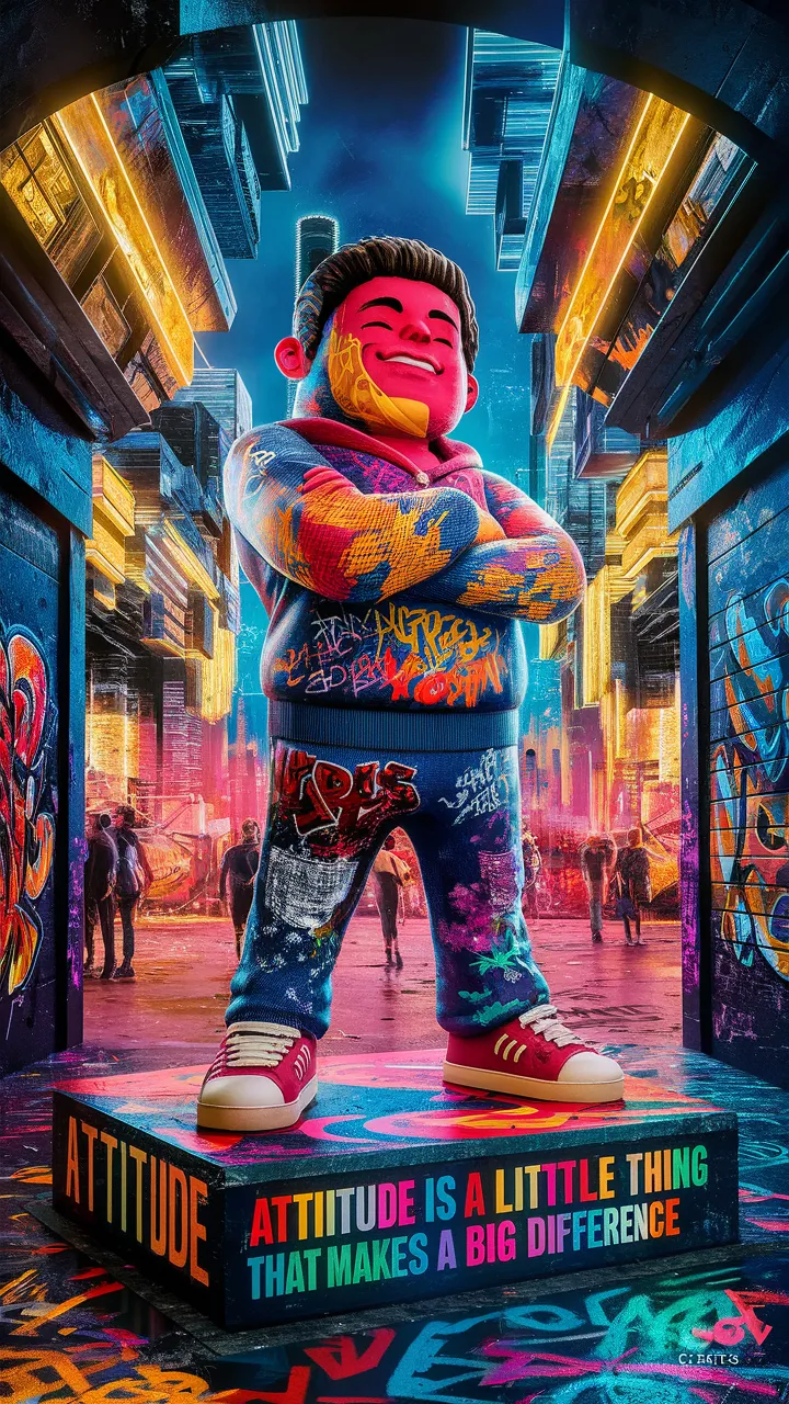 Ideogram (L), Flux.1 (R) Prompt: A striking, urban-inspired illustration featuring a 3D figure exuding confidence, adorned with bold colors and vibrant graffiti. The character stands with crossed arms amidst a bustling cityscape, surrounded by illuminated, futuristic architecture. The platform beneath the figure displays the empowering message, "Attitude is a little thing that makes a big difference." The piece harmoniously integrates graffiti, typography, and illustrative elements, creating an energetic and lively atmosphere. The 3D render, vivid colors, and compelling composition transform this into a visual feast, embodying the spirit of urban art and modern city life., architecture, vibrant, graffiti, illustration, typography, 3d render, photo, poster, painting