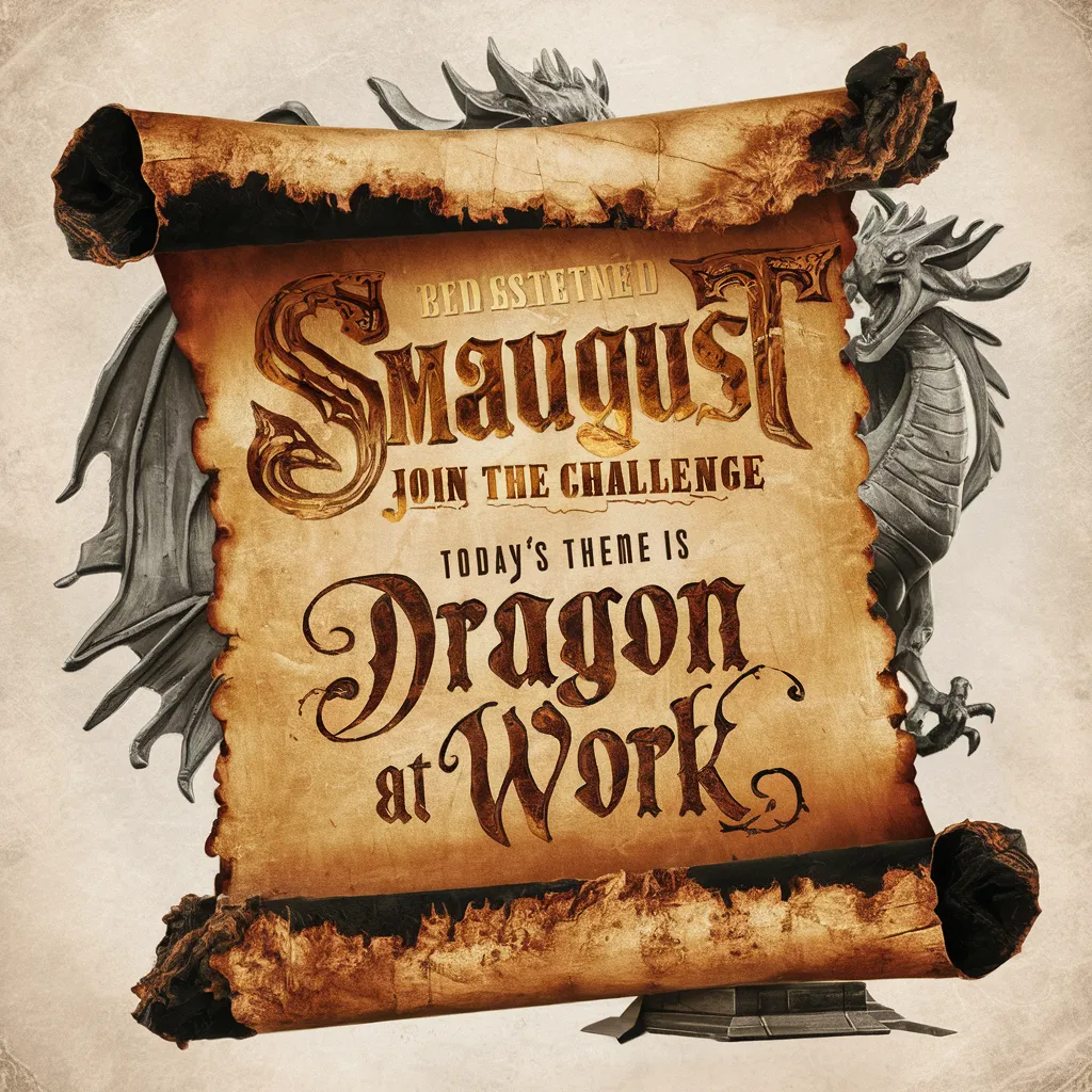 Ideogram (L), Flux.1 (R) Prompt: A captivating medieval illustrated scene featuring an ancient, burnt-edged parchment scroll. The scroll, embossed with large, ornate "SMAUGUST" and "JOIN THE CHALLENGE" in gold letters. The text "TODAY'S THEME IS" and "DRAGON At Work" in a medieval calligraphy is prominently displayed under the emboss. The intricate illustration of a whimsical dragon behind the scroll, with its large wings and coiled position, adds a mystical touch. The overall aesthetic is a blend of chaotic and Statue-themed elements, creating a mesmerizing and immersive atmosphere.