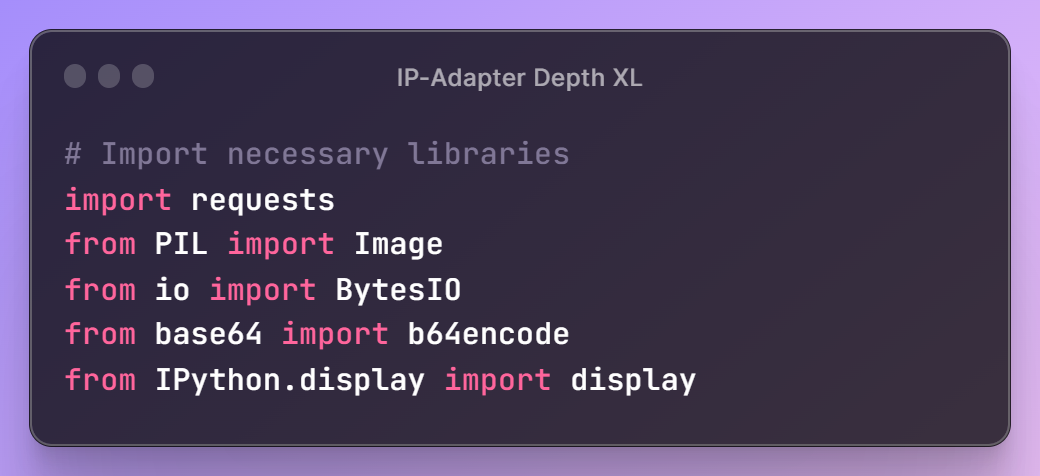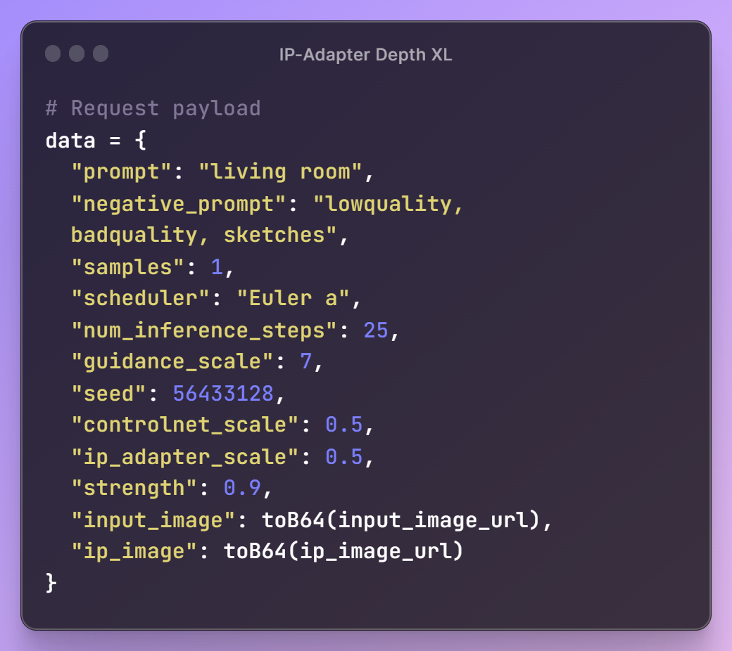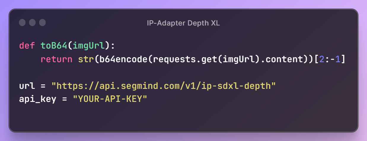 Now, let's define our IP Adapter Depth Url and API key, which will give access to Segmind's models. We will also define a toB64 utility function which will help us to read image files and convert them into proper format which we can use to build the request payload.