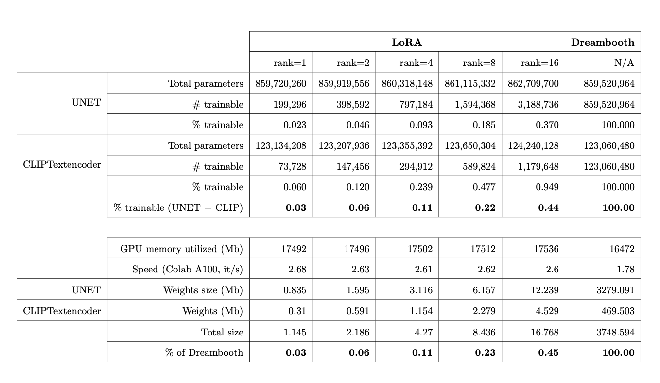 LoRA method focuses on fine-tuning the "residual" of the model rather than the entire model, leveraging the decomposition of the residual into low-rank matrices. Not all parameters need tuning, often, only the cross-attention layer of the transformer model requires it. This layer, where the prompt and the image meet, seems to have a huge impact on the image quality. Thanks to the LoRA technique, the number of trainable parameters is reduced, which means that the GPU requirements are also less. As a result, you get a lower-size model that is quicker to train.