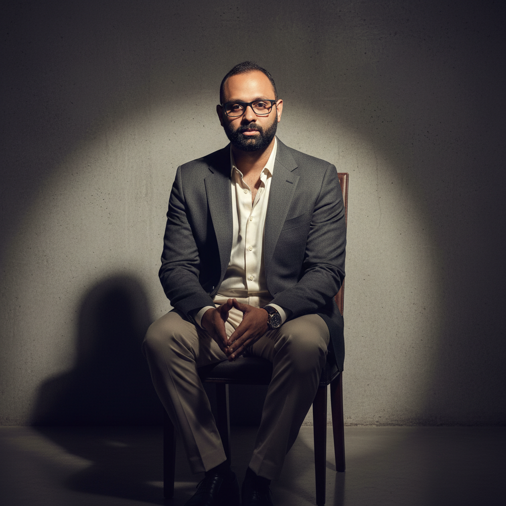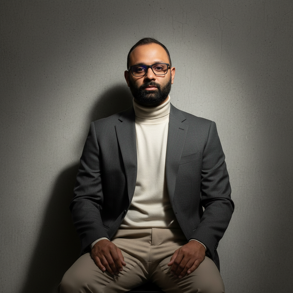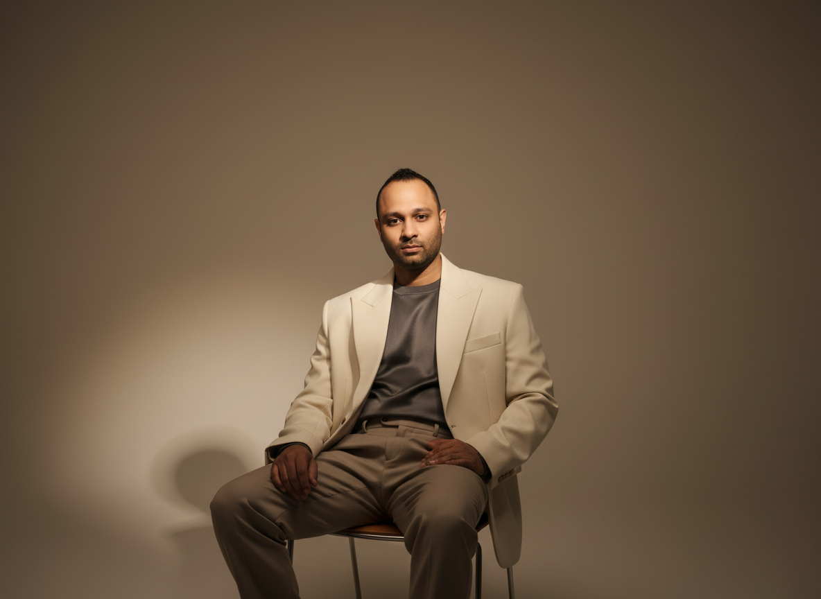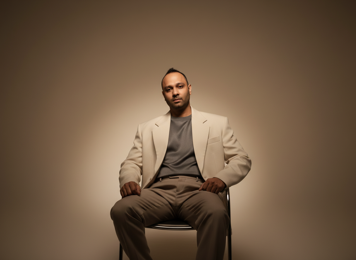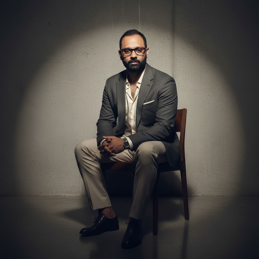 "A mid-length fashion editorial portrait of the person in the images, in a minimalist studio with a subtle cinematic edge. The subject is styled in contemporary designer wear in neutral tones, featuring elegant tailoring and understated luxury. The pose is relaxed yet commanding, seated with refined posture and an editorial presence. Lighting is softly dramatic, with a directional spotlight effect that sculpts shadows and highlights, adding depth and sophistication while keeping the overall palette clean and modern. The background is a seamless beige gradient backdrop with a faint spotlight glow, creating a polished yet dramatic stage for the look. Inspired by high-fashion spreads from Vogue Homme and L’Officiel: ultra-sharp focus, 8k resolution, cinematic color grading, and a balance of minimalism with striking editorial flair."