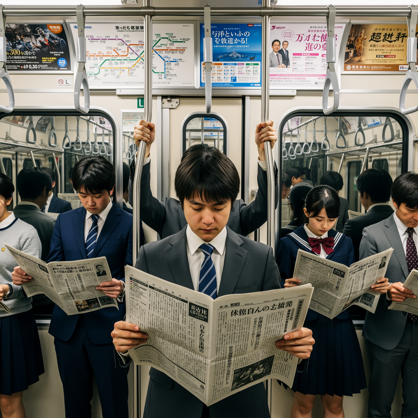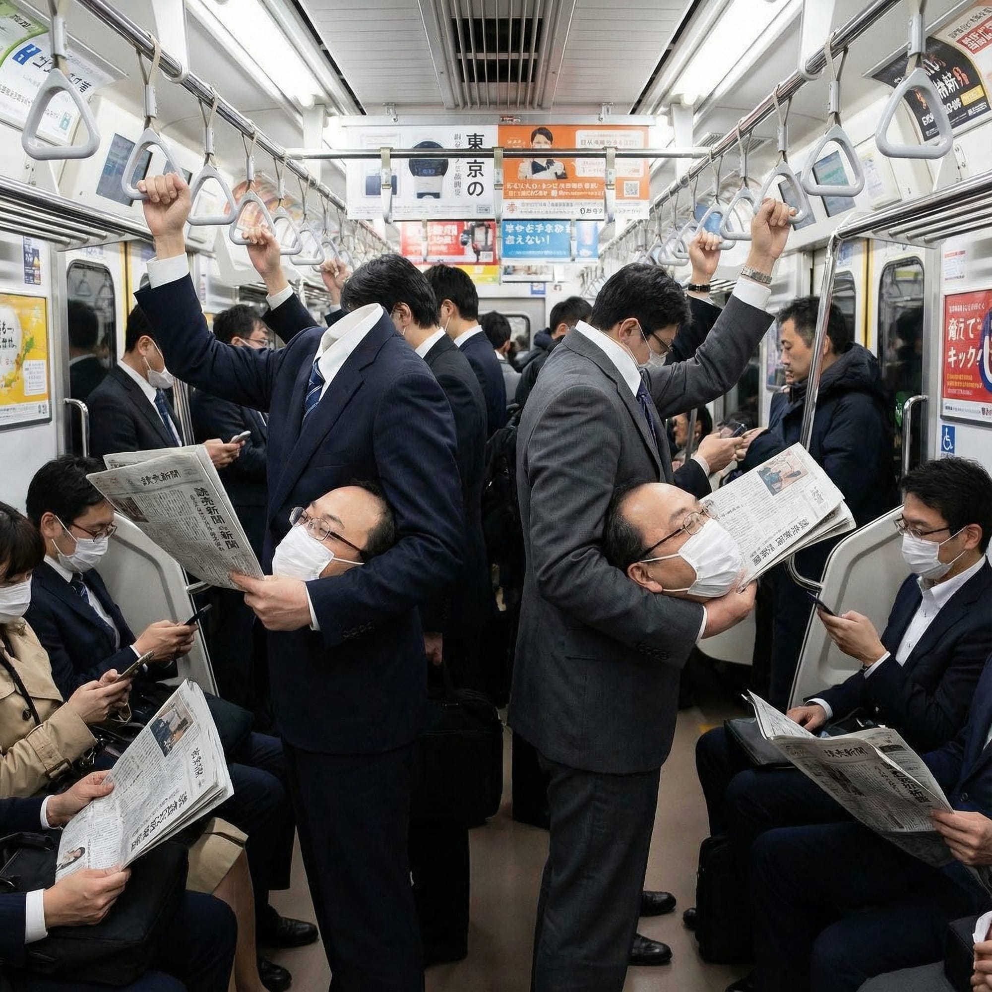 A completely ordinary Tokyo subway car during morning rush hour, but every passenger is holding their own head in their hands like a bowling ball, calmly reading the newspaper with their detached head while their bodies stand holding the pole.