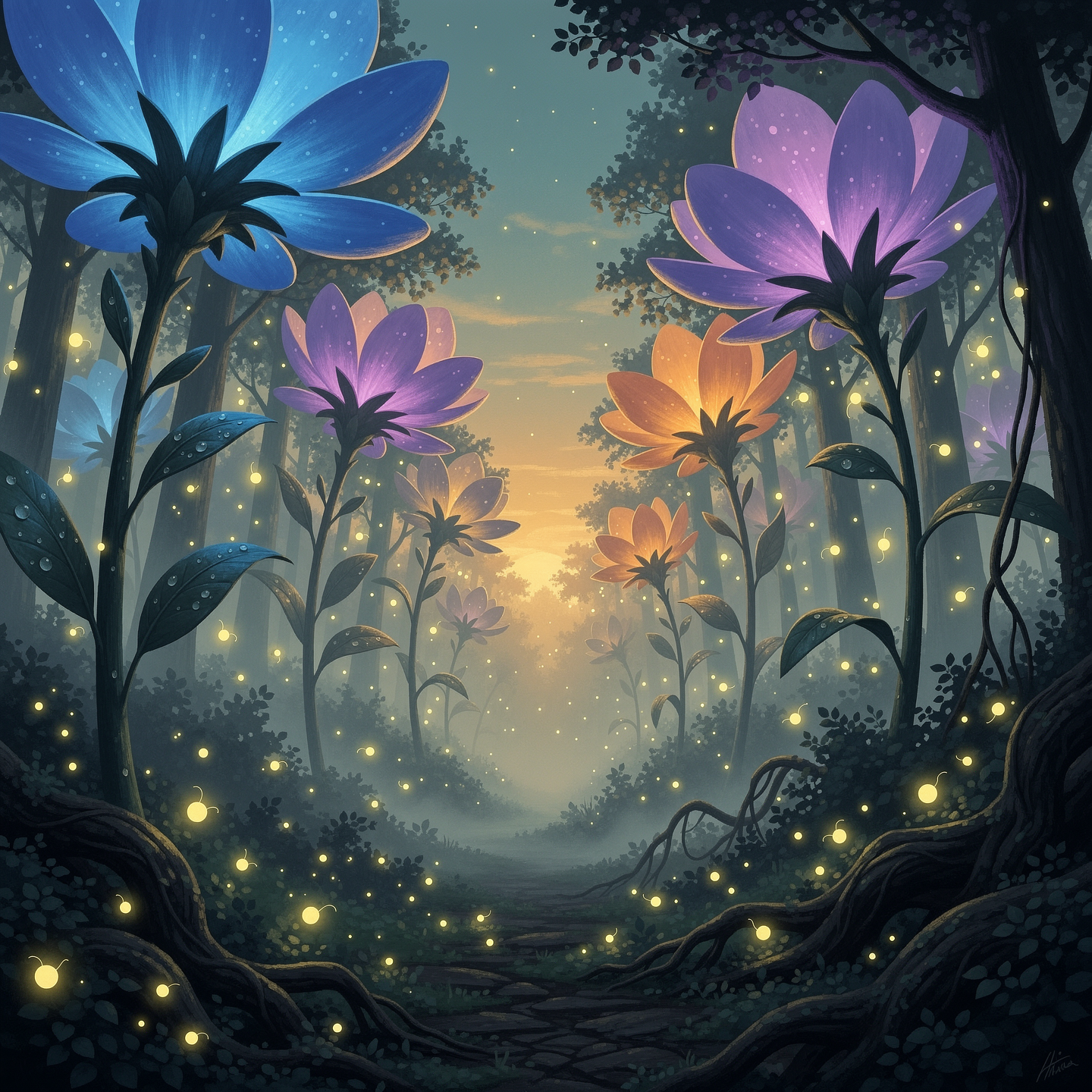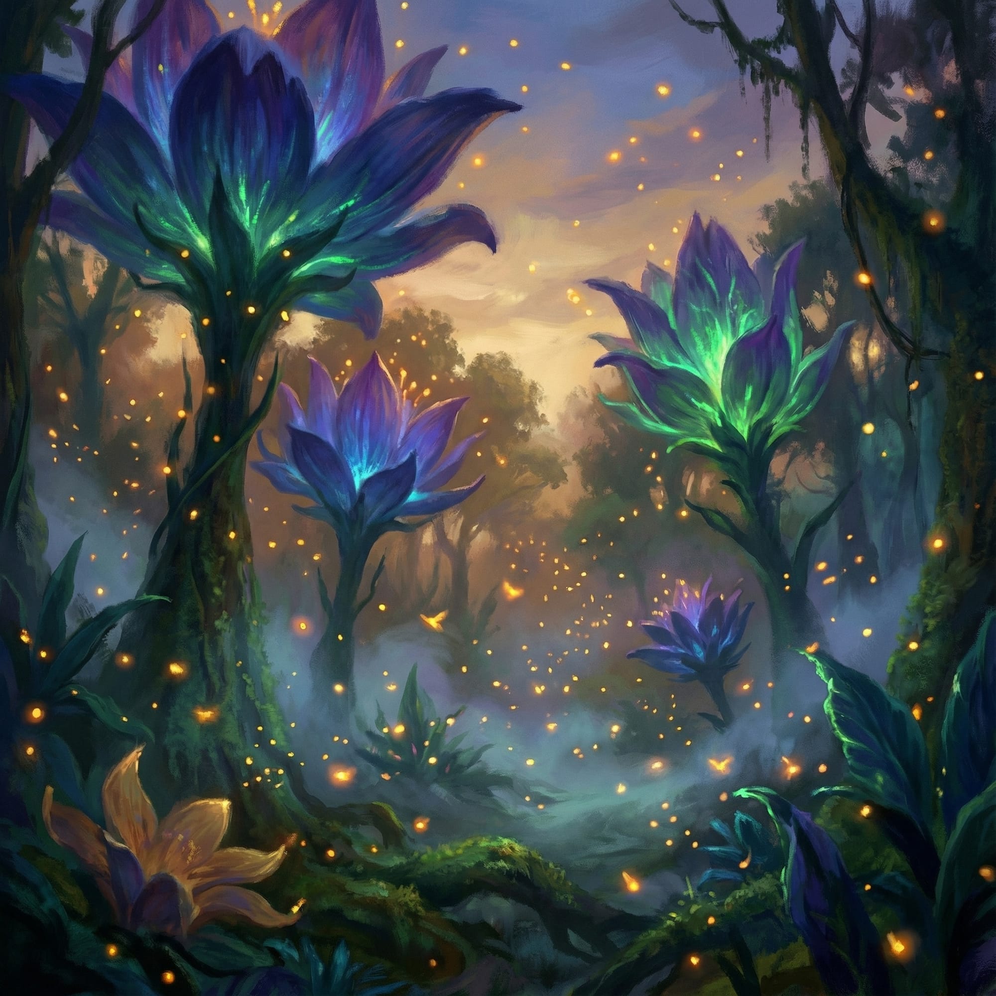 An enchanted bioluminescent forest at twilight, giant flowers the size of trees, glowing fireflies drifting among them, soft, magical light filtering through mist, painterly style with warm and cool tones blending, dreamy atmosphere