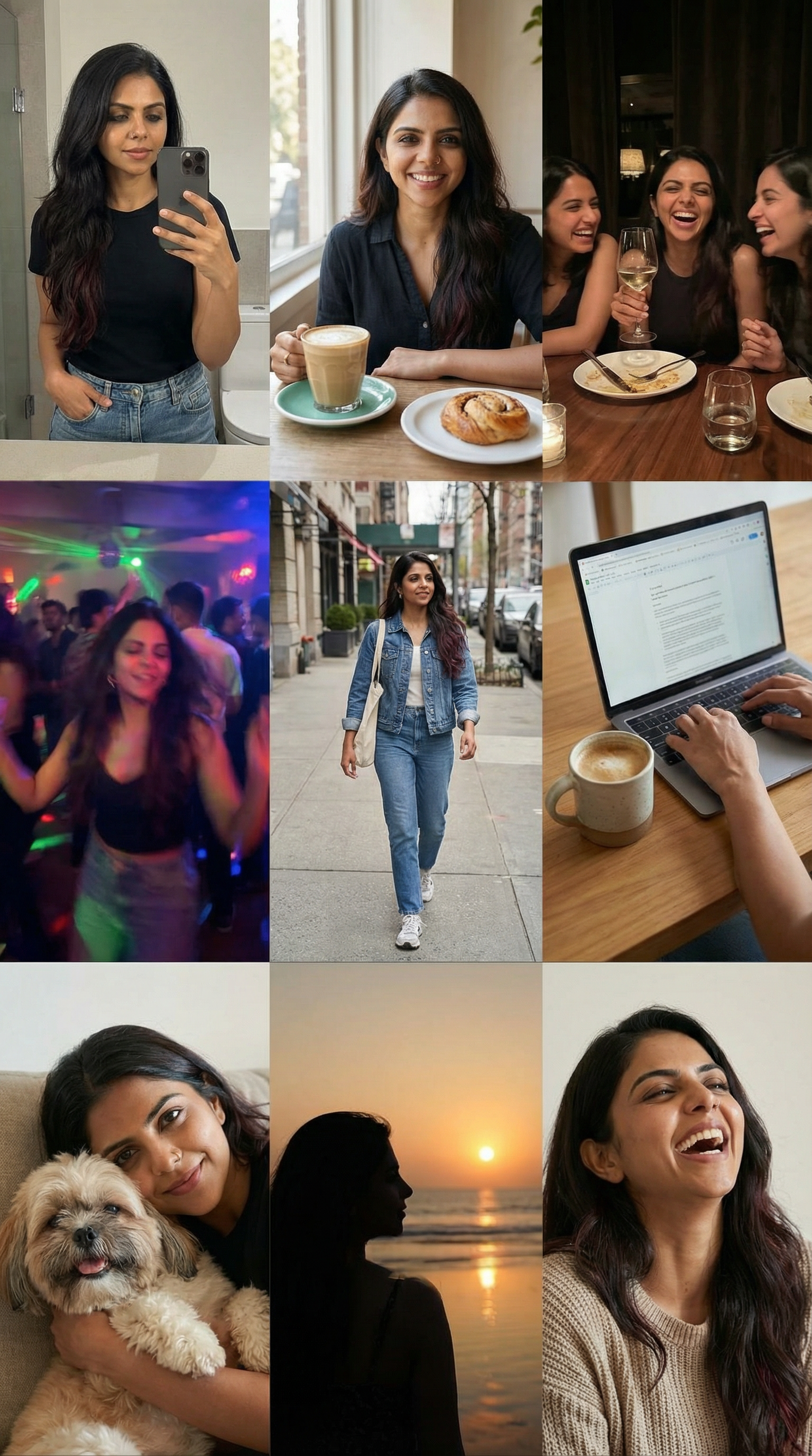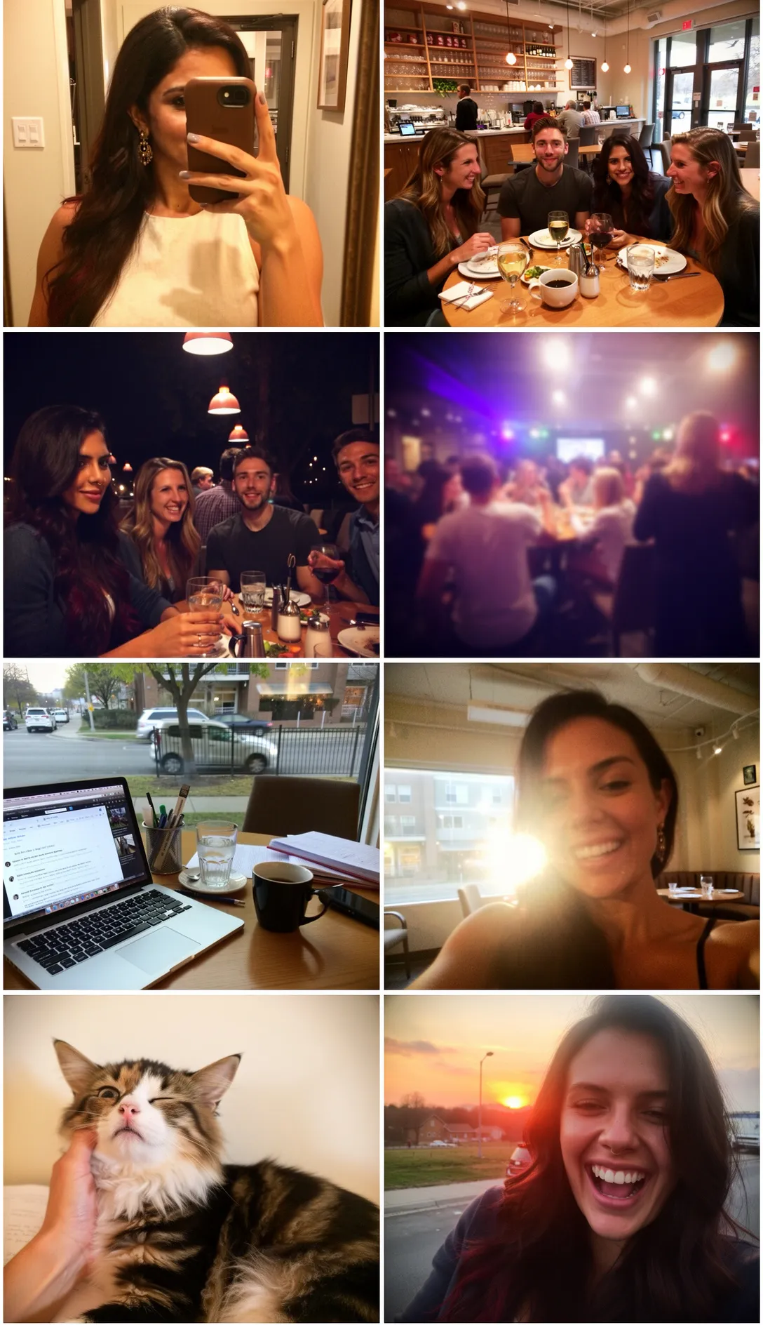 Generate a 9-image ‘photo dump’ grid of this person’s weekend: a mirror selfie, a café shot, friends at dinner, a blurry party photo, a walking shot, a laptop/coffee work shot, a pet moment, a sunset, and a candid laugh.