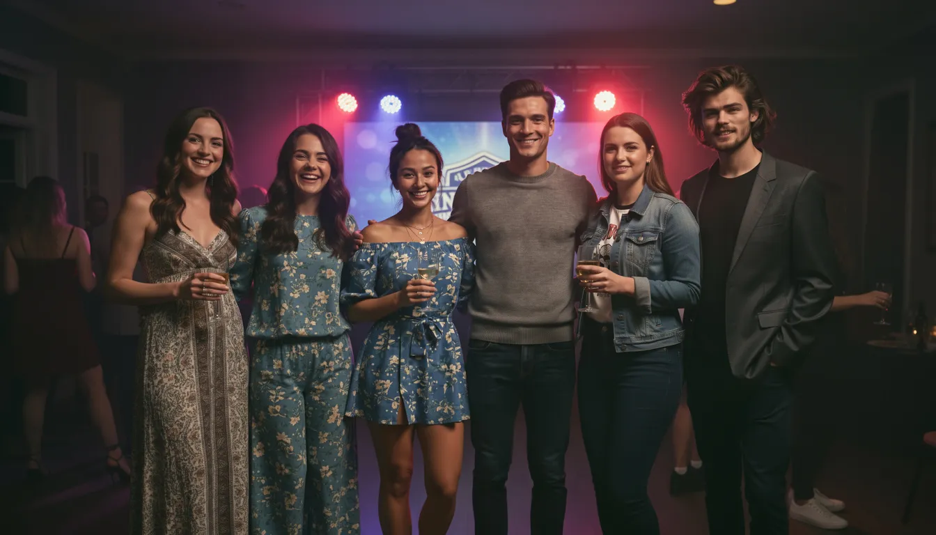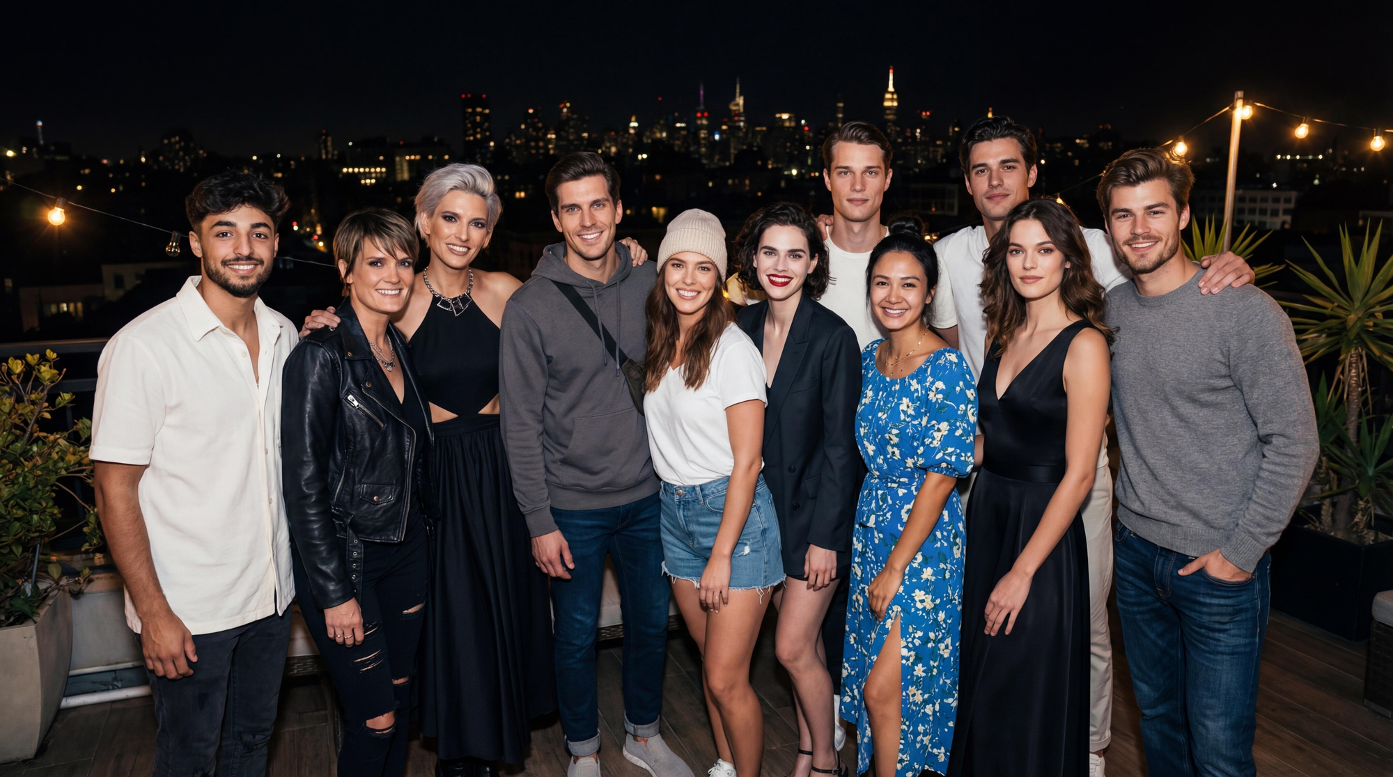 Combine all these photos of different people with exact facial references, a party-night group photo with these characters in similar outfits, and there should be no repeated photos.